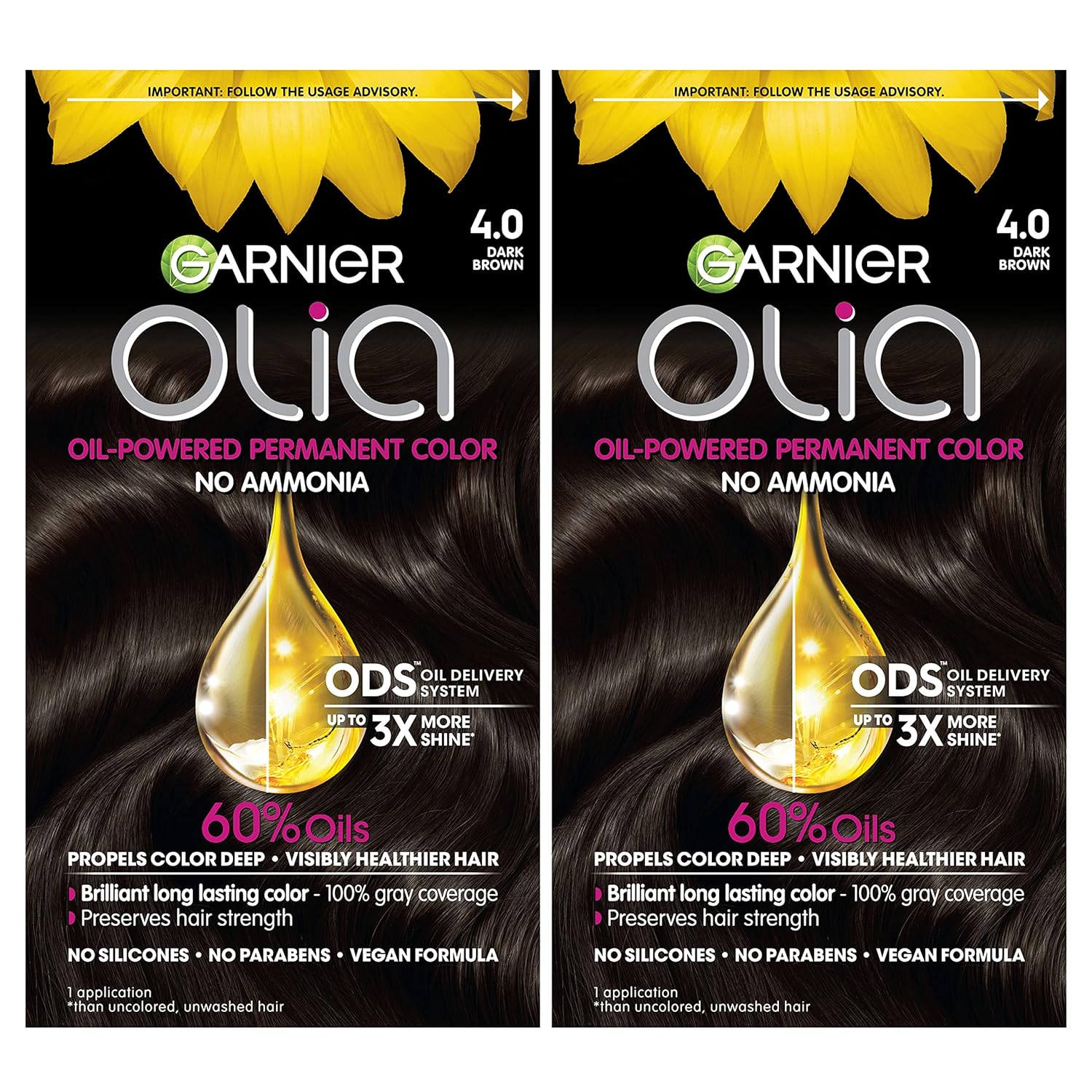 Garnier Hair Color Olia Ammonia-Free Brilliant Color Oil-Rich Permanent Hair Dye, 4.0 Dark Brown, 2 Count (Packaging May Vary)