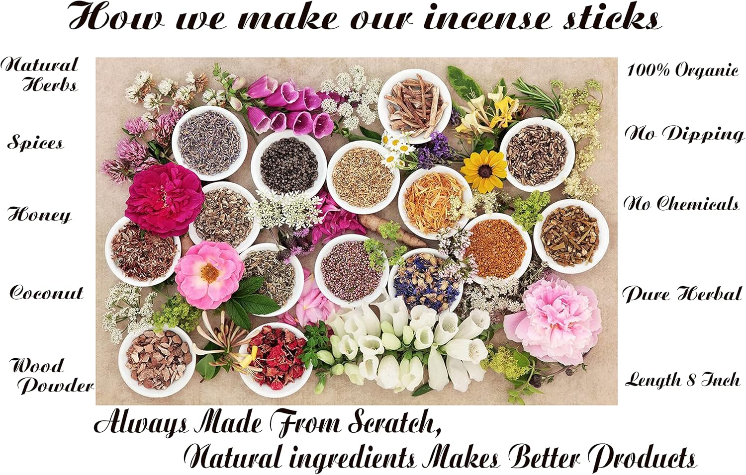 - 100% NATURAL -Lavender Natural incense Sticks completely handmade MADE FROM SCRATCH by blending natural resins, Herbs, Spices with aromatic wood powders, charred coconut powder fragrant oils and honey.No Dipping in Toxic Chemicals.