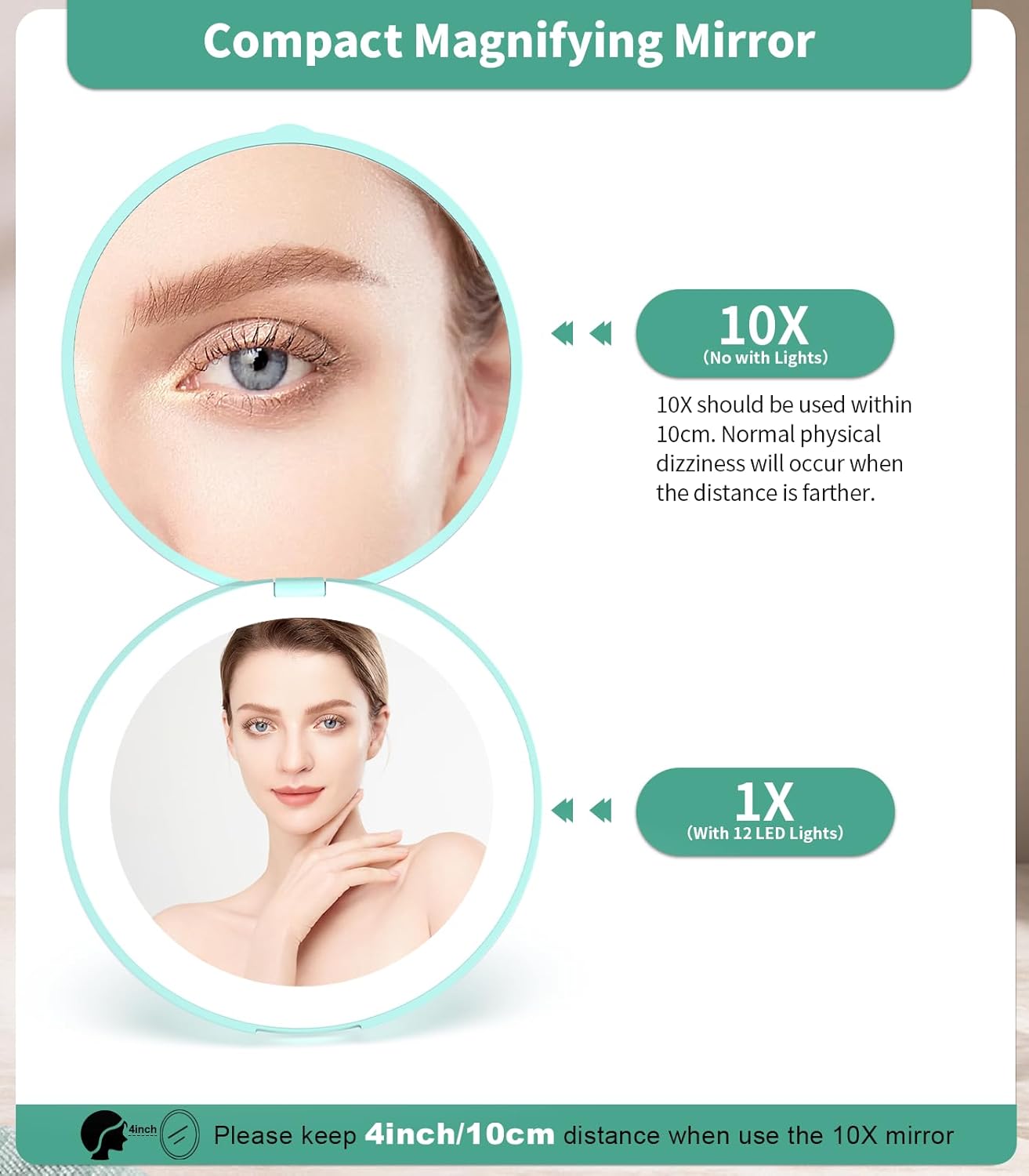 WOBSION LED Lighted Travel Makeup Mirror, 1x/10x Magnification, Compact, Portable for Handbag, Purse, Pocket, 3.5 inch Illuminated, Folding, Handheld, 2-Sided, Round, Cyan