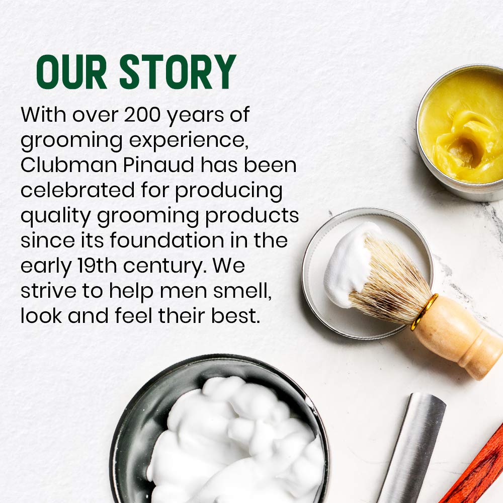 • MADE IN THE US, CRUELTY-FREE, TRUSTED FOR GENERATIONS: With over 200 years of grooming experience, Clubman Pinaud is a trusted brand. Clubman has been celebrated for producing quality products since its foundation in the early 1800s. Men have been using their products for generations, while younger users are turning to their products for trusted grooming solutions with a sense of nostalgia, proving quality never goes out of style. Completely cruelty-free, proudly made in the USA.