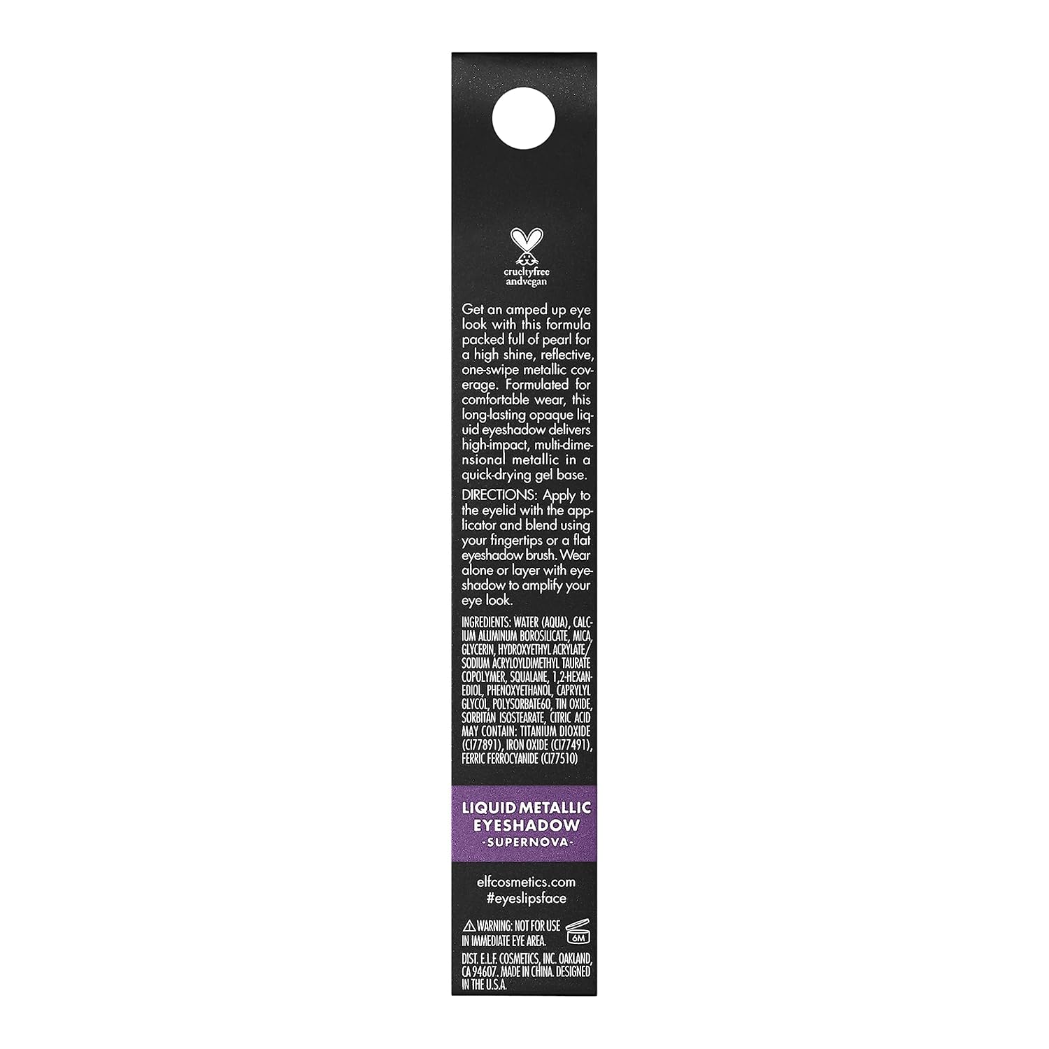 - AMPED UP EYE LOOK: Get an amped up eye look with e.l.f. Liquid Metallic Eyeshadow! This liquid eyeshadow delivers a high-impact, metallic finish through multi-dimensional metallic pearls. The shade Supernova is Amethyst purple with light blue and lavender shimmer.