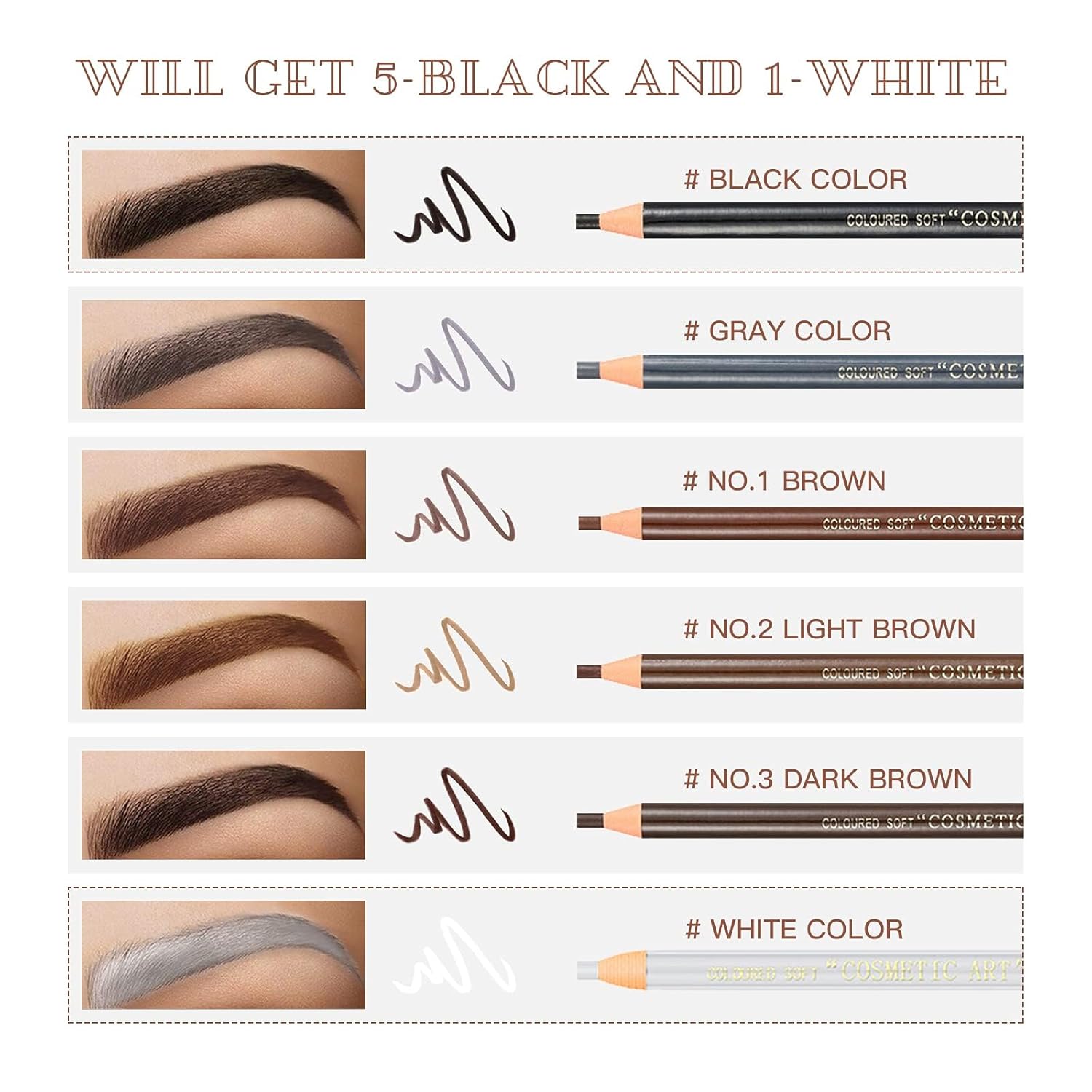 - 【Package Includes】 You will get: 5 Peel-off Eyebrow Pencil, 1 White Eyeliner Pencil, 2 Eyebrow Trimming Blade (Sharpeners), 3 Eyebrow Stencils, 1 Eyebrow Brush (Spoolie).