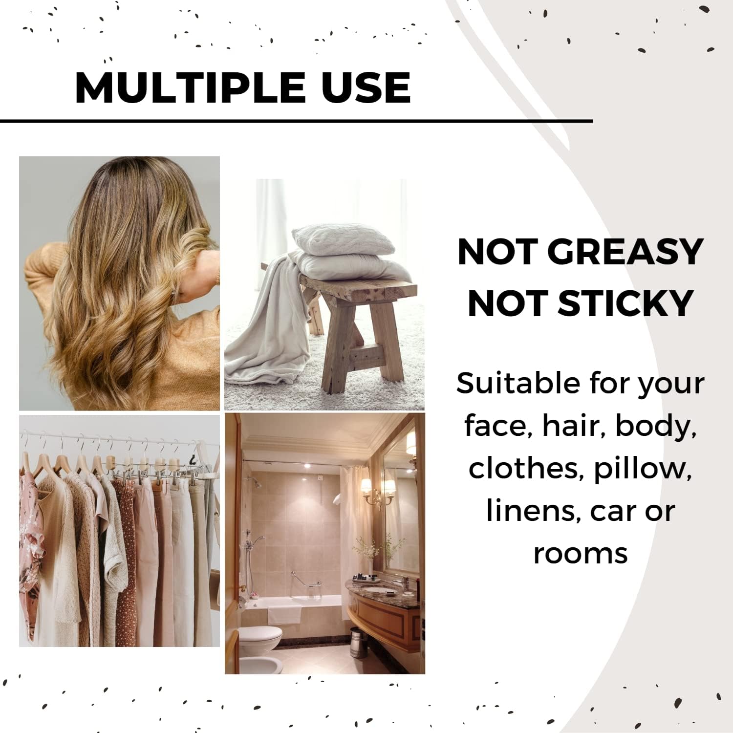 - Multiple USES: This essential oil spray is non-greasy & non-sticky. Suitable for your face, hair, body, clothes, pillow, linens, car or rooms