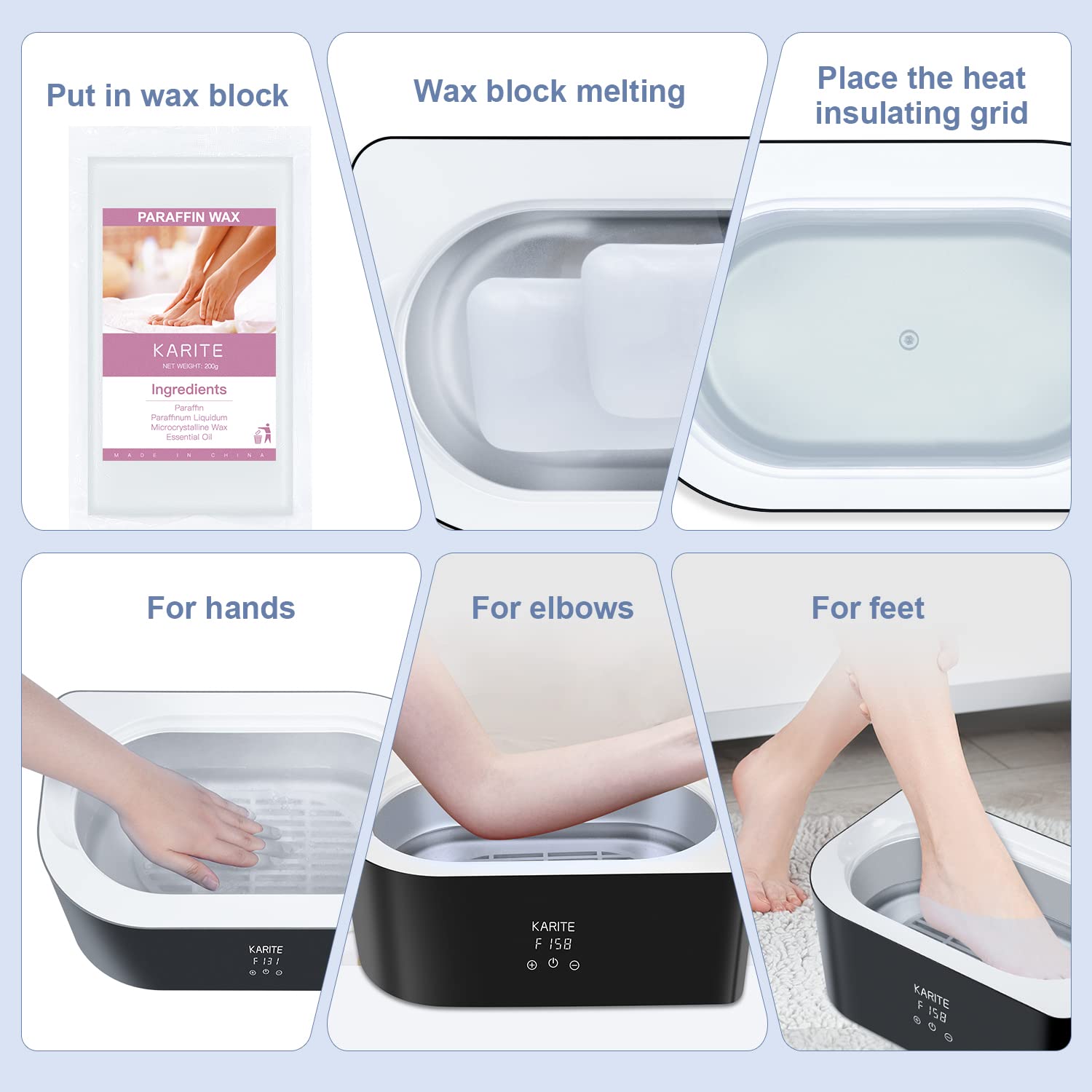 - WIDELY USED FOR HEAT WAX BATH β If you are suffering from dry hands, cracked heels, rough elbows, stiffness and fatigue muscles, you should really give paraffin hot wax compress a try. KARITE paraffin wax beads pack is a perfect refill choice for your paraffin bath due to its high cost efficiency and great quality.