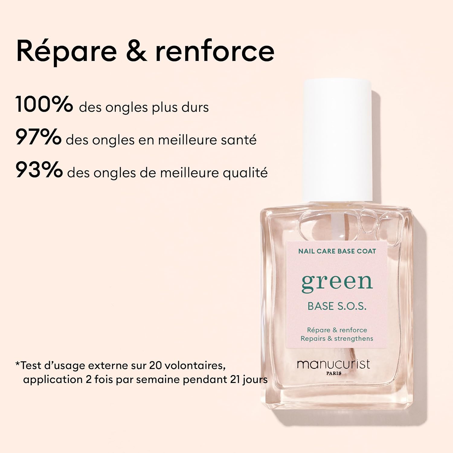 - β HOW TO USE? For maintenance, apply as a strengthening base on its own or before applying the Green color of your choice. For restorative treatment, apply twice a week to regain healthy and rejuvenated nails.