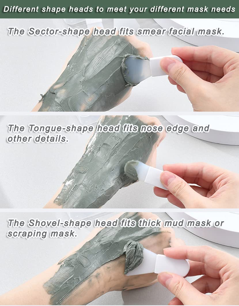 - Silicone Brush Head: The brush head is made of soft silicone, safe and non-toxic, soft and not easy to break, and can be reused.easy to clean, quick drying. Different shape heads to meet your different mask needs; The sector-shape head fits Apply mask ,The small tongue-shape head fits nose edge and other details, The shovel-shape head fits thick mud mask or scraping mask.