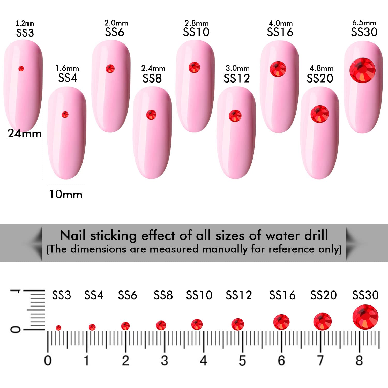 - Different Sizes Available:These rhinestones for crafts come in a wide range of sizes (1.6mm, 2mm, 2.4mm, 2.8mm, 3mm, 4mm, 4.8mm) to suit your different needs