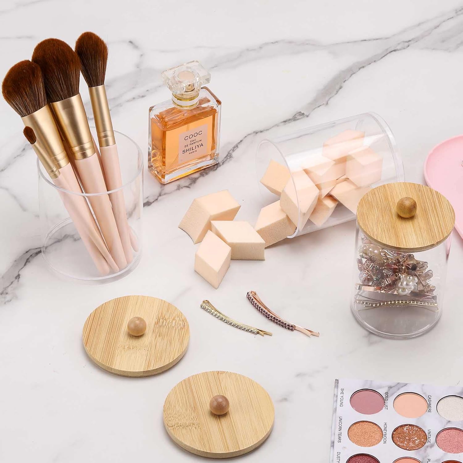 Tbestmax 4 Pack Qtip Holder Dispenser Cotton Ball, Cotton Swab, Floss - 12oz, 10 oz Clear Plastic Apothecary Jars for Bathroom Organizer and Storage Containers (Bamboo Lids)