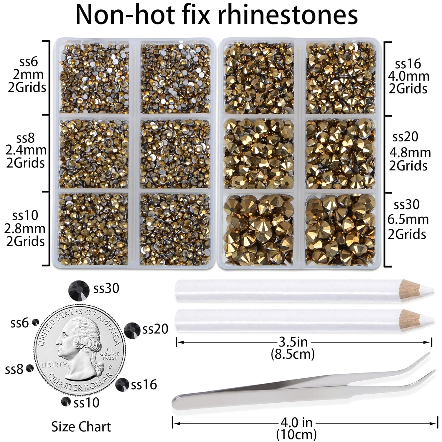 LPBeads 6000 Pieces Metallic Gold Non Hotfix Rhinestones 6 Sizes Round Crystal Glass Flat Back Rhinestones with Tweezers and Picking Pen for Nail Art Crafts Bags DIY