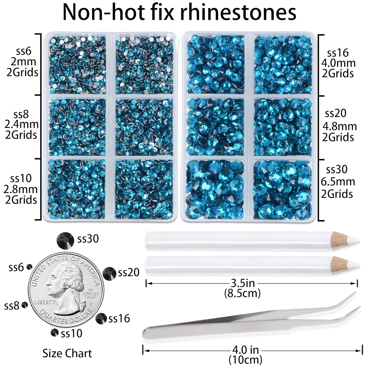 - Approx 6000 pcs of good quality sparkly flatback glass rhinestones with tweezers and 2 picker wax pencils help you easily pick up and set rhinestones in all your jewelry.