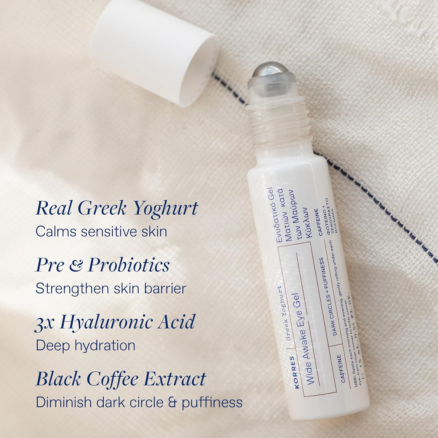 KORRES Greek Yoghurt Wide Awake Eye Gel Serum with Hyaluronic Acid and Caffeine for Dark Circles, Puffy Eyes and Under Eye Bags, Roller Massage Ball Applicator, Brightening and Hydrating, 0.51 fl oz