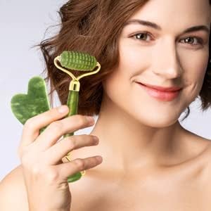 100% Real Crystal Jade Stone Roller and Gua Sha Set with Vitamin C Serum | Great for Eye Puffiness Treatment, Skin Tightening, Anti Aging, Rejuvenate Face & Neck | Great Gift for Women & Men (Green)