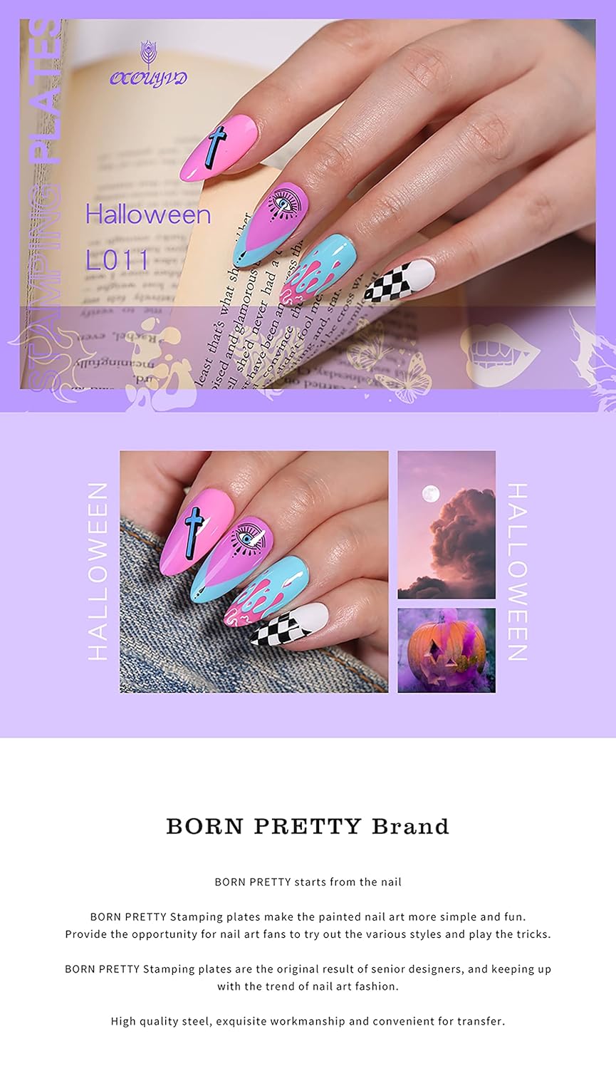 - đź’€Package: 6 Pcs Halloween nail stamping plates, designed with spider webs, ghosts, bats, witch, evil cat and other Halloween elements.