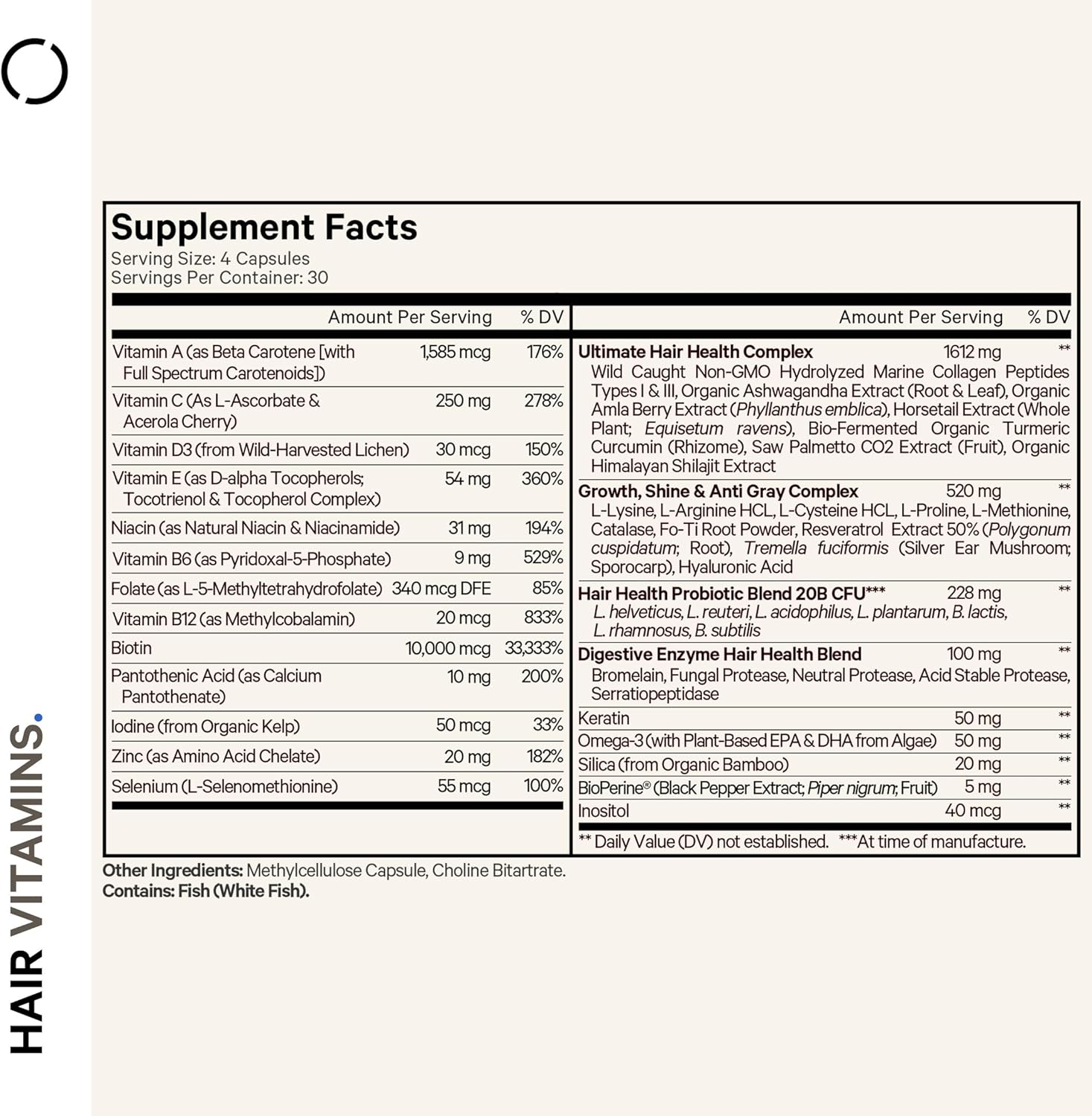 - Comprehensive Hair Nutrient Blend: Codeage Hair Vitamins supplement features 10,000 mcg of biotin, hydrolyzed wild-caught marine collagen types I and III, keratin, and essential vitamins A, B6, B12, C, D3, and Eโall in one formula to complement your hair care routine. It also includes omega-3 with plant-based EPA and DHA.