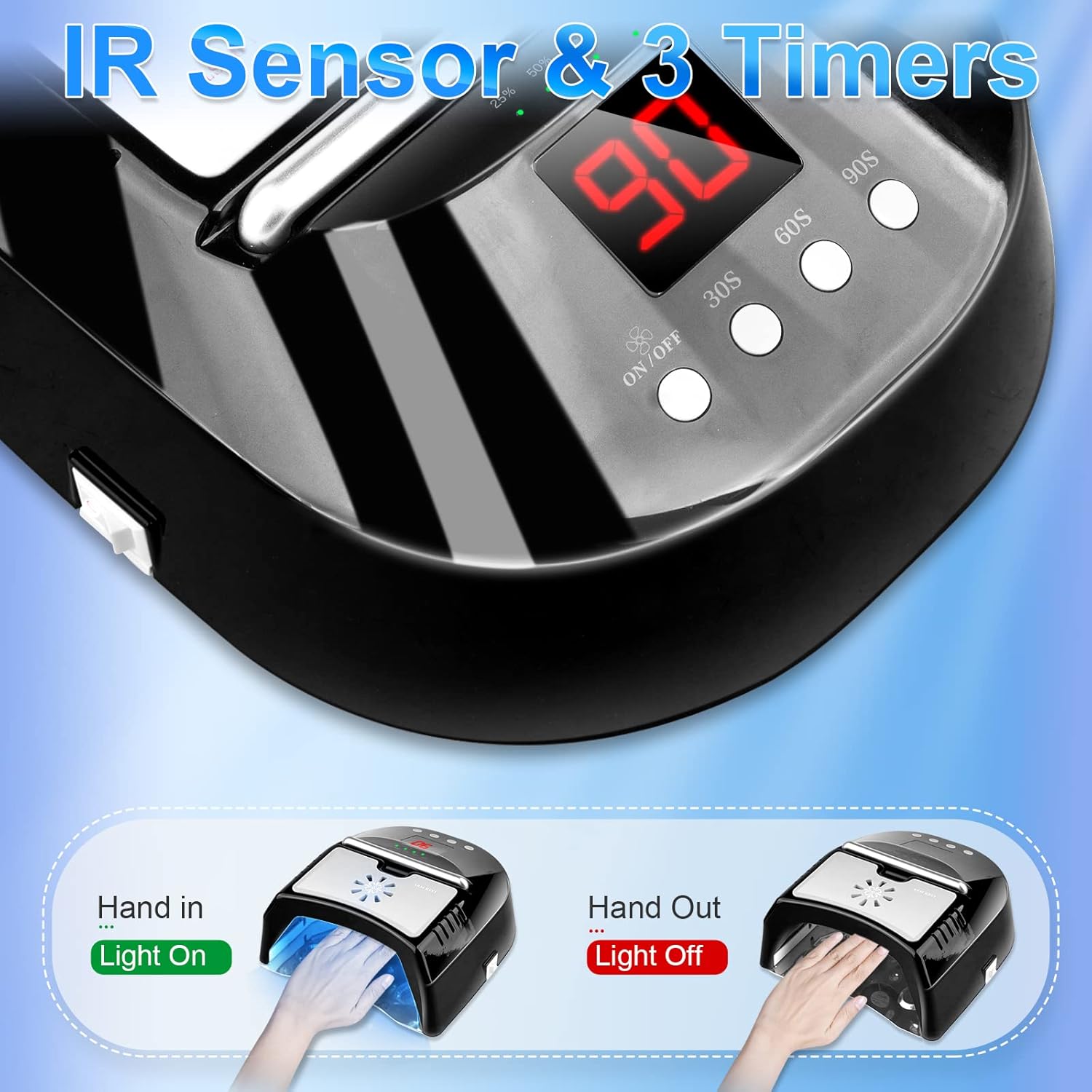 • 【Smart Auto Sensor & 3 Times setting】 This intelligent uv lamp for gel nails has an infra-red auto sensor allows automatically light up and off when you put in/ take out your hands without pressing any button and works for 60s. It is adjustable in 3 timer settings of 30s/60s/90s. Our professional gel UV-led nail lamp equipped with a fan to protect your tender skin from hot and pain when curing gel polish.