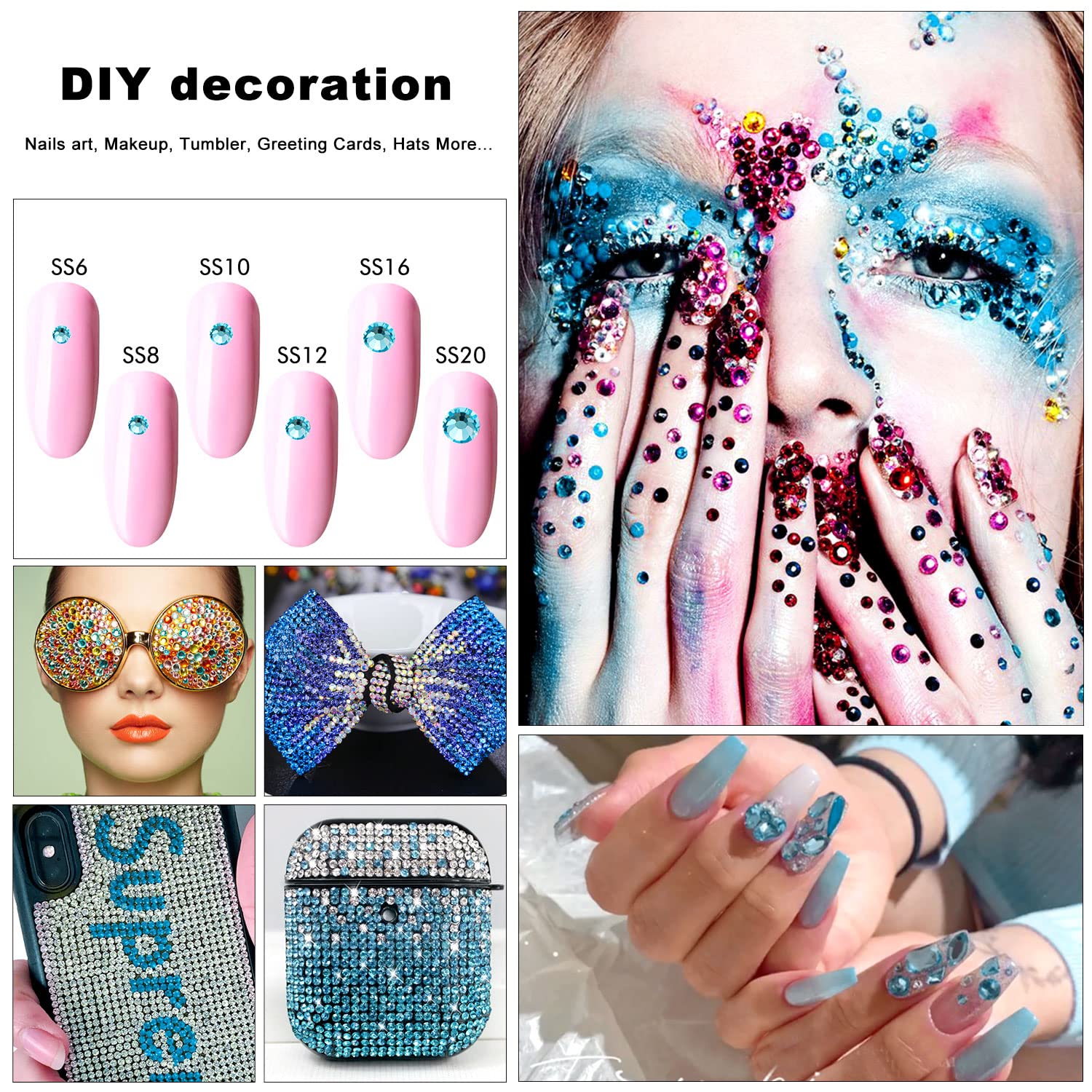 - 💎Uses: You can use rhinestones for nails, art, jewelry, skin, teeth, face, eyes, makeup, glasses, crafts, cardstock, cell phones, phone cases, plastic, glasses, etc.