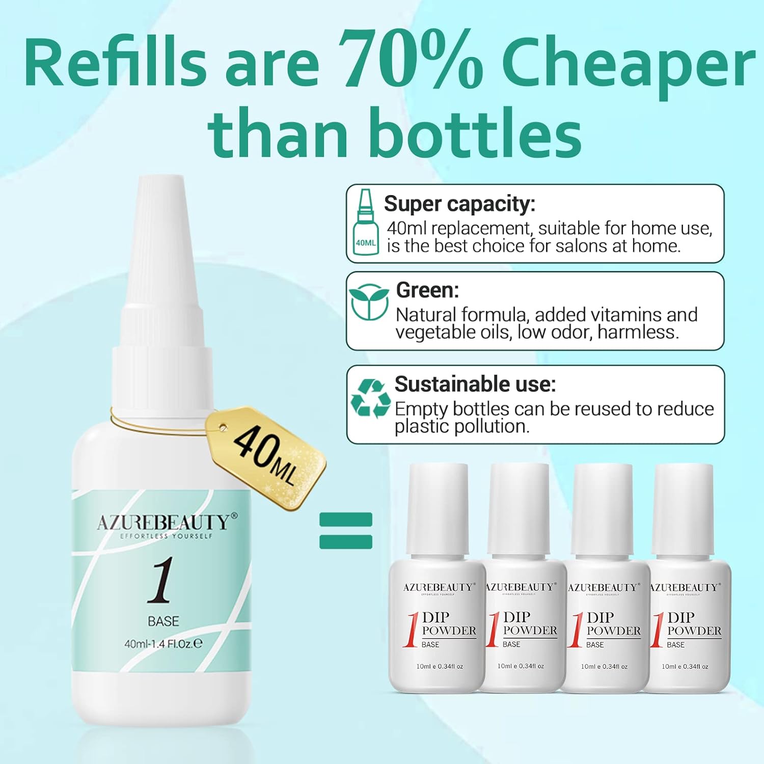 - β Super Capacity Base Coat Refill: 40ml large capacity home replacement pack is the best choice for home salons. (Note: only for dip powder.)