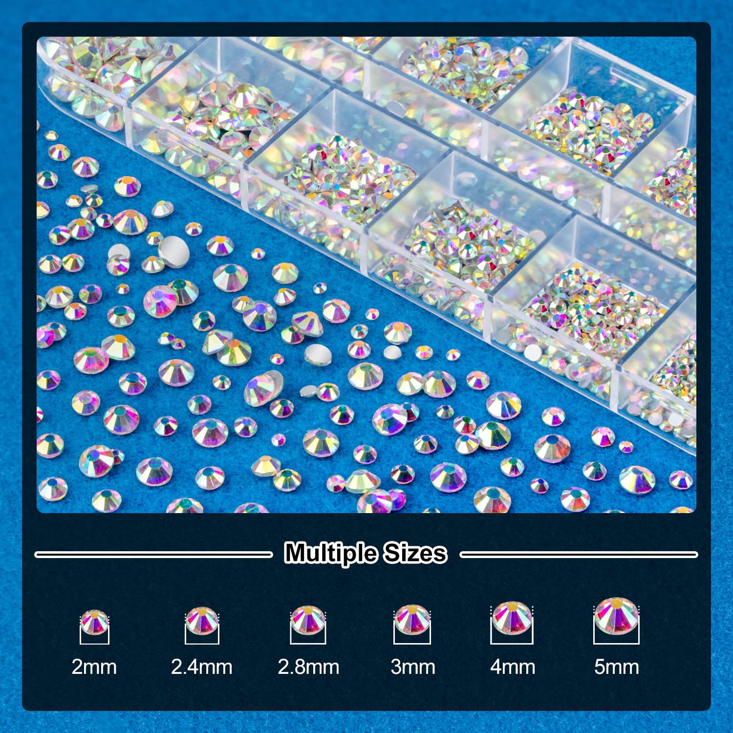 - 💎MULTIPLE SIZES AND COLORS: This set provides 1 box of Flat-back round mixed color rhinestones with 3 sizes: 2mm, 3mm, 4mm; 1 box of Flat-back round glass AB gems with 6 sizes: 2mm、2.4mm、2.8mm、3mm、4mm、5mm. Great size range and various colors for your nail art decoration!