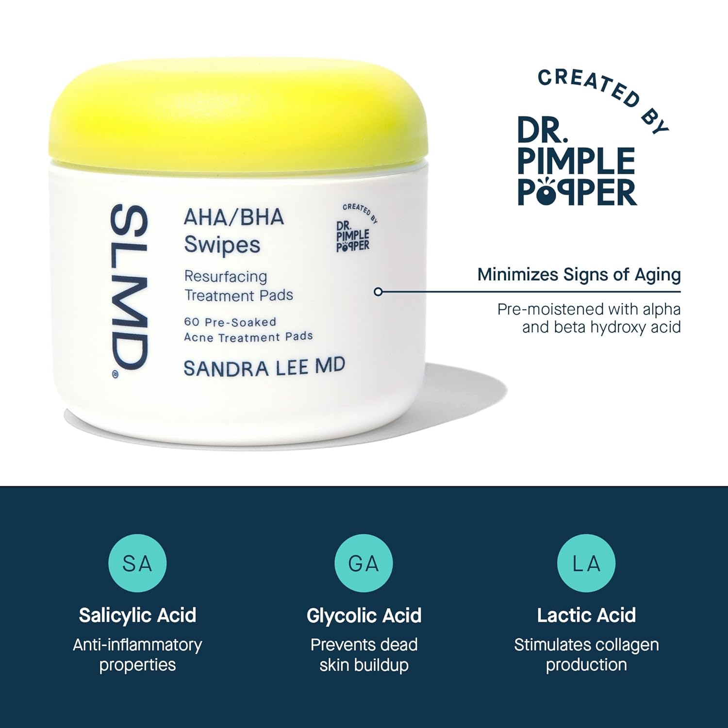 SLMD by Dr. Pimple Popper - AHA BHA Toner Pads Swipes, Salicylic Acid, Glycolic Acid & Lactic Acid - Daily Resurfacing Pads for Face & Body - Facial Exfoliating Resurface, Treat, and Prevent Acne