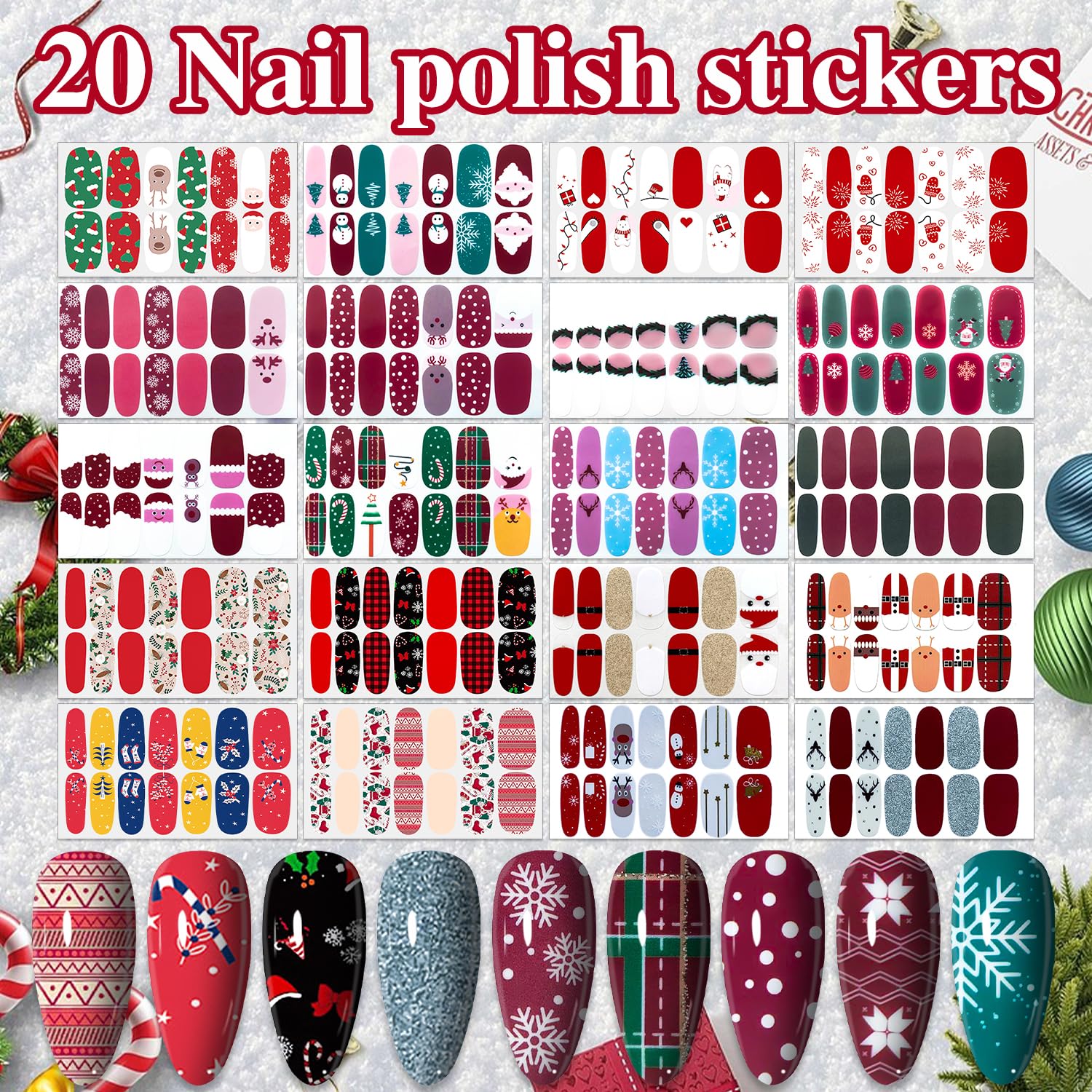 WOKOTO 20pcs Christmas Nail Polish Stickers - Full Nail Wraps, Holiday Nail Art Strips with 280 Tips - Christmas Tree, Socks, Elk, Snow Designs Stickers for Women Girls Nails Gel Strips Wraps