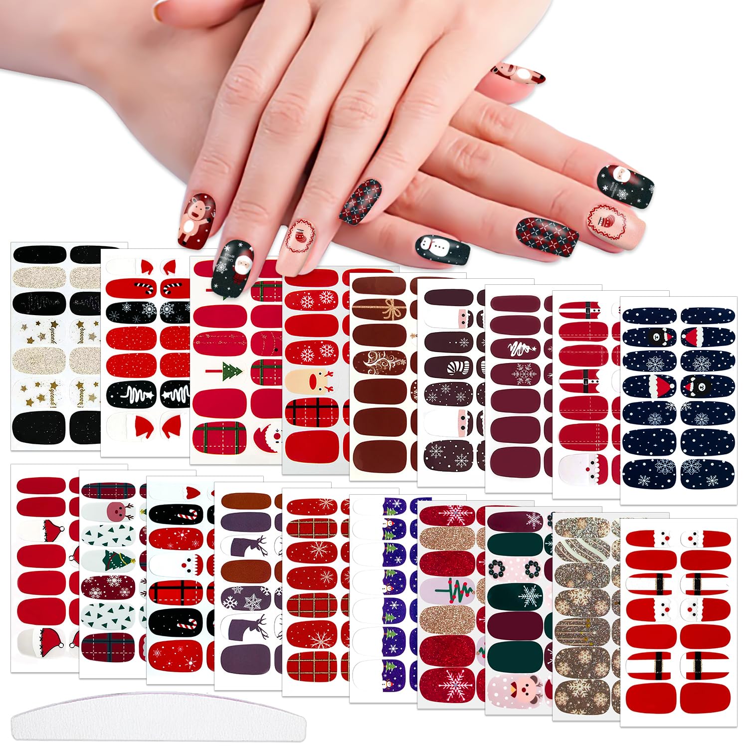 - ăPacket Contentă:20 sheets Christmas nail polish strips + 1pc moon shape nail art files, 14 sheets are different Christmas theme, each sheet strips has 14 tips with 7 different size to meet large-scale sizes of nails and replace in daily life.