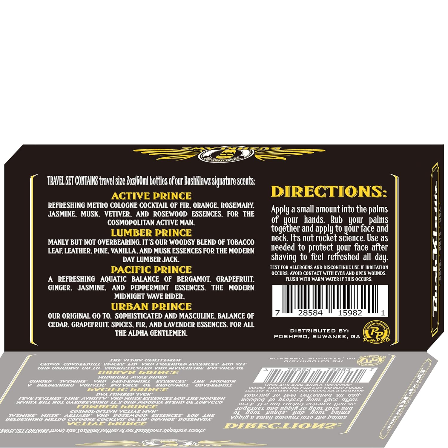 • Contains 2oz travel size sampler bottles of each of our famous BushKlawz Scents: Active, Lumber, Pacific, & Urban. If you can't decide on a scent, this is the go to.