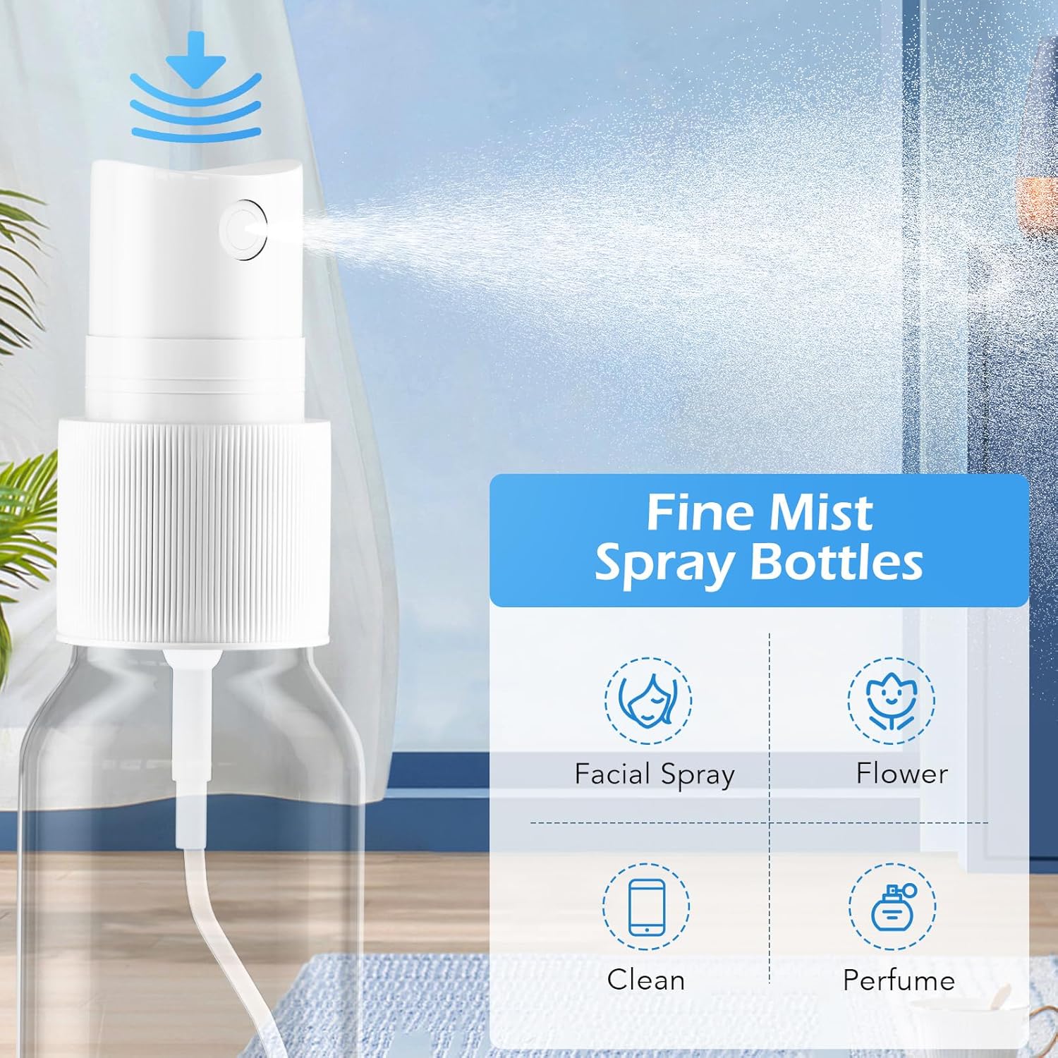 Spray Bottles, 2.7oz/80ml Clear Empty Fine Mist Plastic Mini Travel Bottle Set, Small Refillable Liquid Containers with 2pcs Funnels and 24pcs Labels (6 Pack)