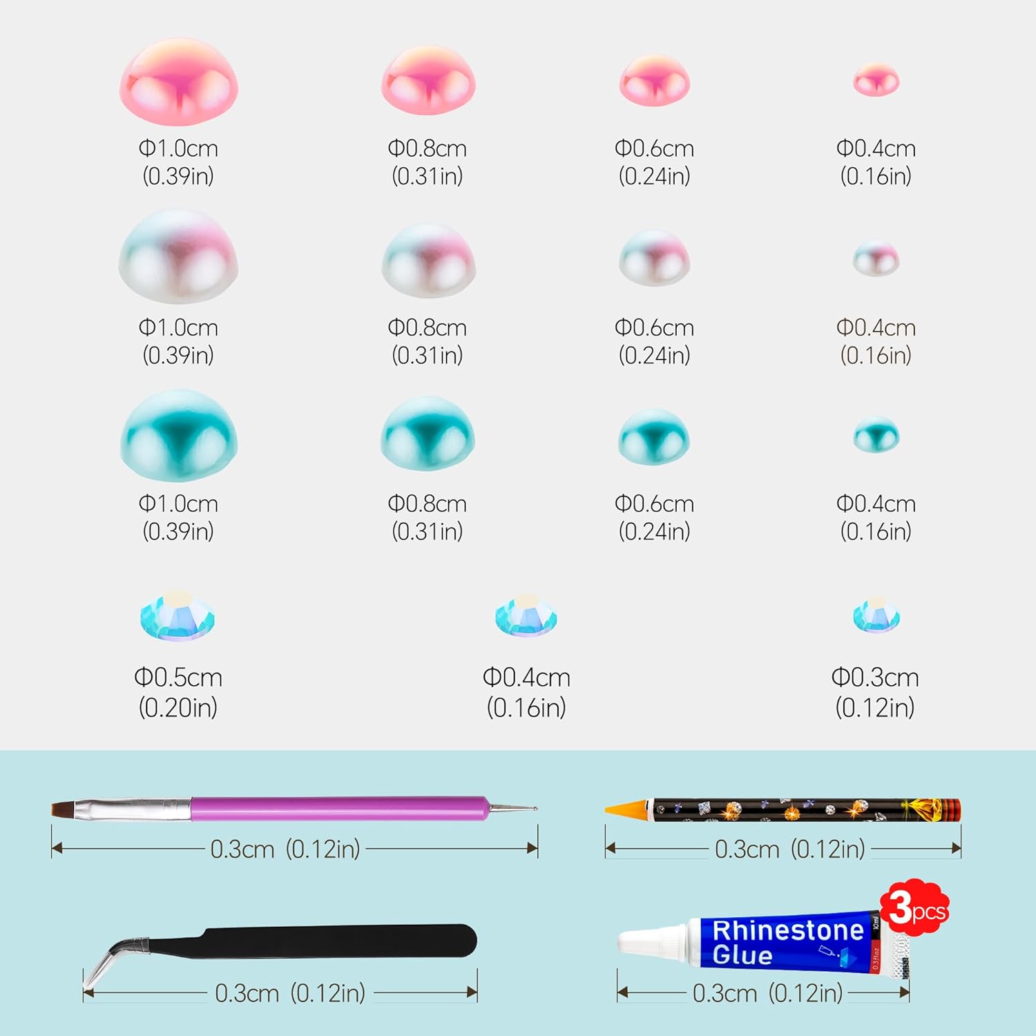 - What You Will Receive: 60g(30g*2)mixed size flat back pearls and rhinestones. 3*Rhinestone Glue. 1* wax pencil for rhinestones. 1*Pencil sharpener(color random). The mix half round pearls and rhinestones can make more beautiful handicrafts for your friends, parents, yourselfs on any festivals.If you need a mixed size pack of pearl rhinestones