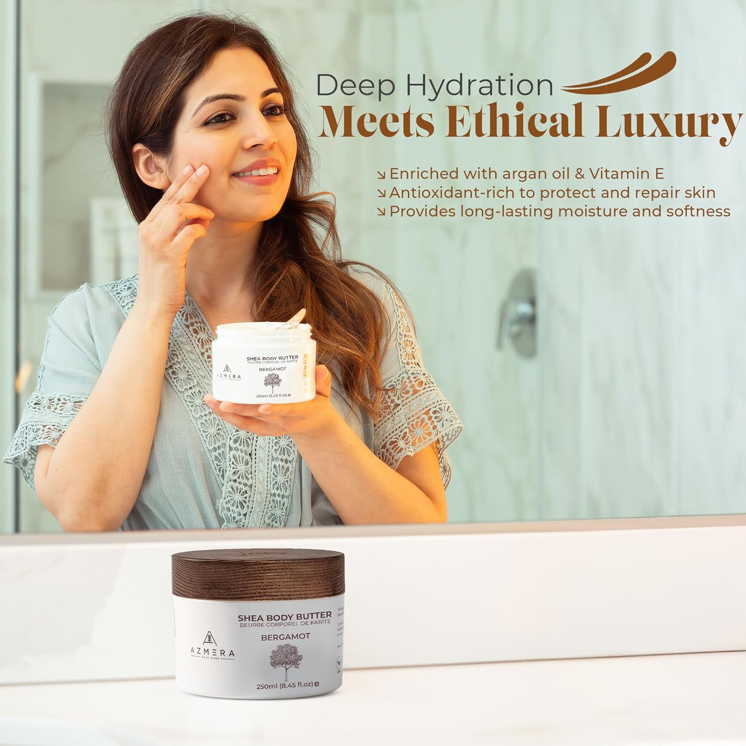 AZMERA Handcrafted Whipped Shea Body Butter – Luxurious Moisturizer for Dry, Sensitive Skin with Bergamot, Argan Oil & Vitamin E – Vegan, Non-Greasy Skincare – 8.82 oz