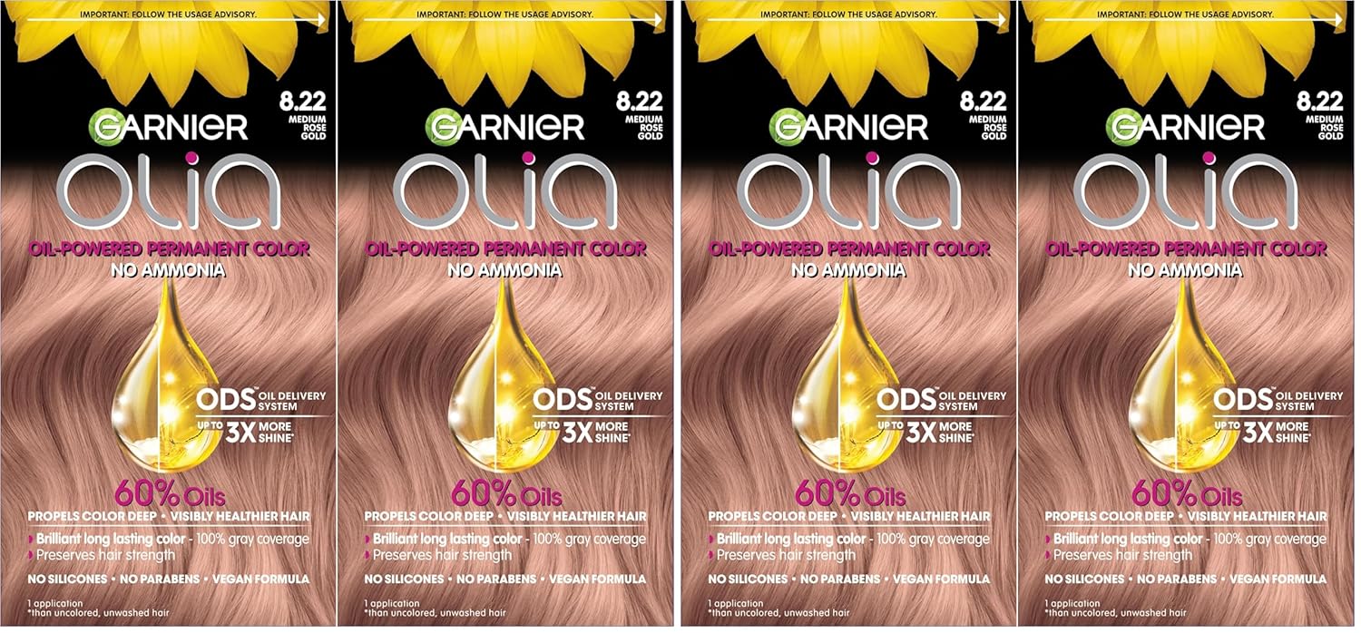 Garnier Hair Color Olia Ammonia-Free Brilliant Color Oil-Rich Permanent Hair Dye, 8.22 Medium Rose Gold, 2 Count (Packaging May Vary) (Pack of 2)