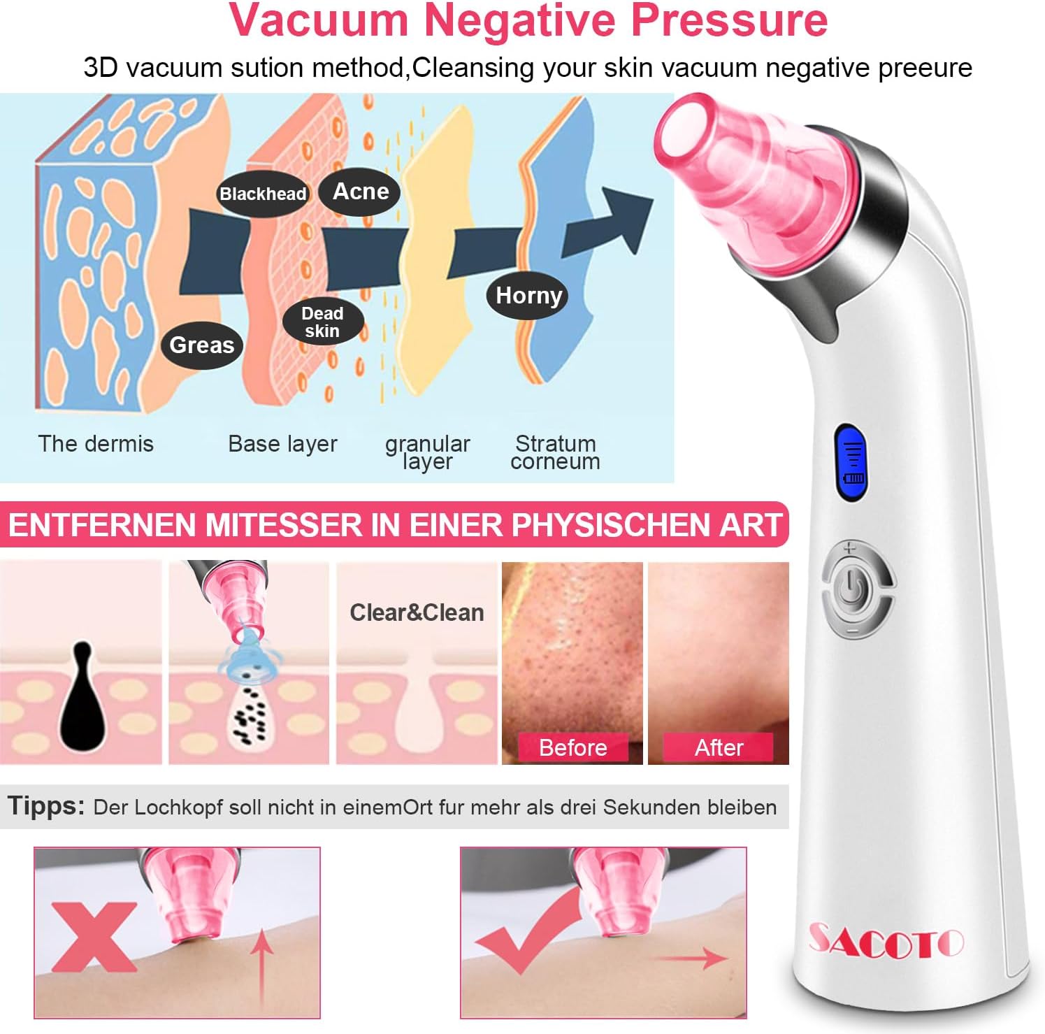 - Pore Vacuum: Our pore vacuum has 5 suction level for a variety of skin types. This electric blackhead vacuum can use for sensitive and dry skin, for neutral skin, for mixed and oily skin. It has 4 different replaceable suction probes, which you can choose according to your skin condition