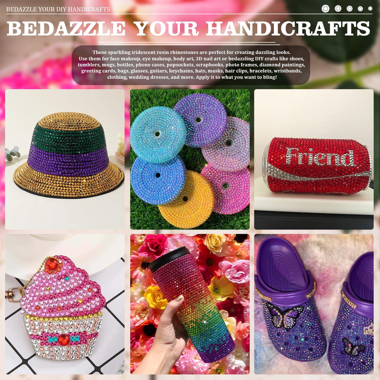 • 💎WIDE APPLICATION -- These sparkling iridescent resin rhinestones are perfect for creating dazzling looks. Use them for face makeup, eye makeup, body art, 3D nail art or bedazzling DIY crafts like shoes, tumblers, mugs, bottles, phone cases, popsockets, scrapbooks, photo frames, diamond paintings, greeting cards, bags, glasses, guitars, keychains, hats, masks, hair clips, bracelets, wristbands, clothing, wedding dresses, and more. Apply it to what you want to bling!