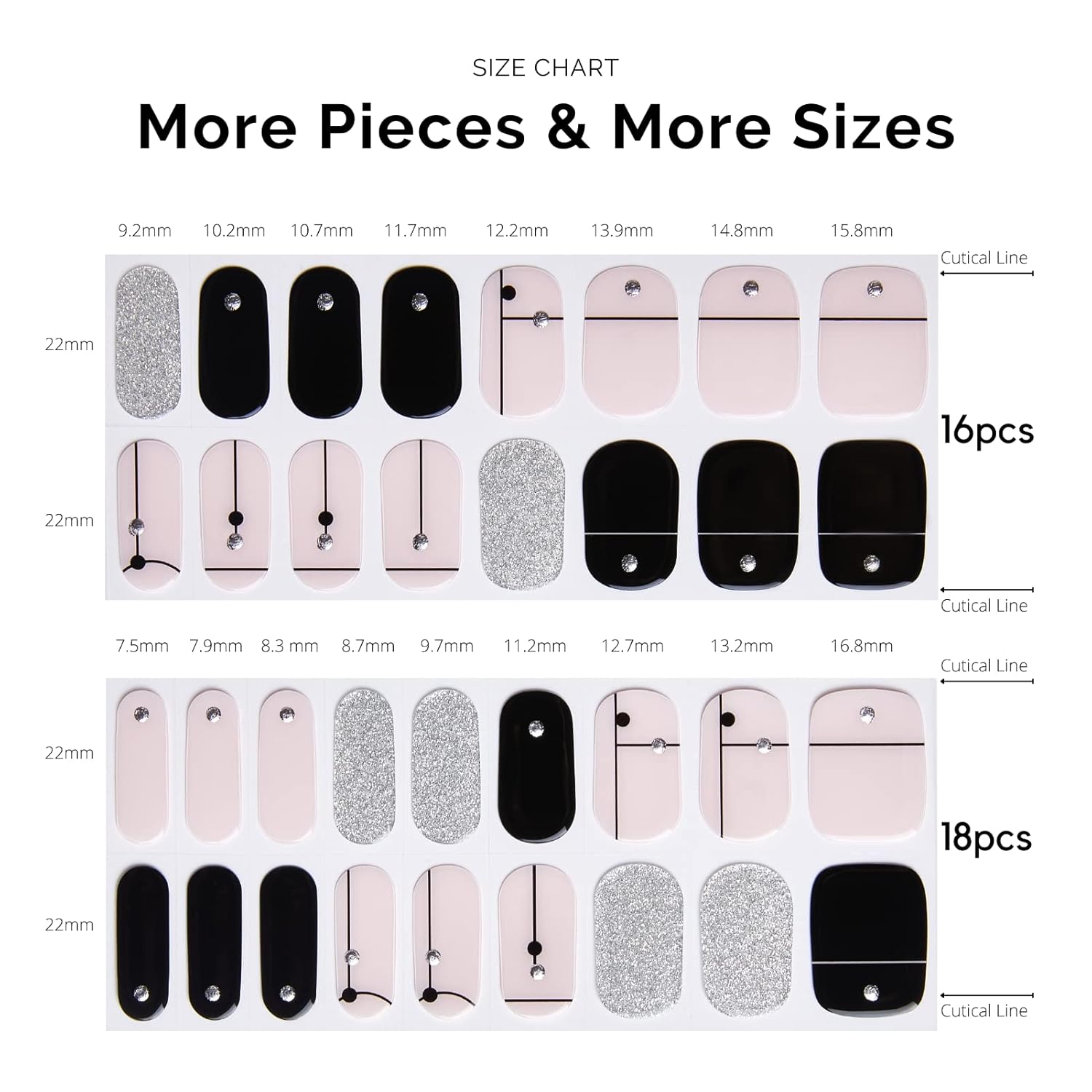 - ă34 PCS NAIL STRIPSăMore Quantity & Sizes than Ever! - With 17 different sizes of our nail art stickers, you can easily find the right size to match your nails. - New curved side line fits even better with your nail shape for seamless adhesion.