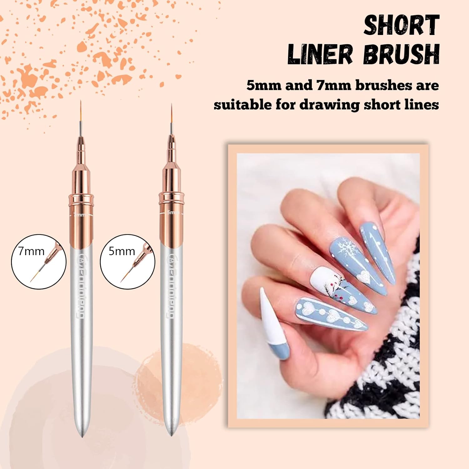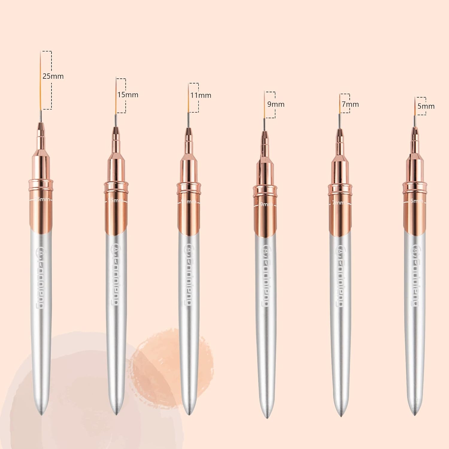 - Value Pack - This set includes 6 small nail art brushes of different lengths(5/7/9/11/15/25mm), meet various nail art needs. From intricate designs to simple patterns, you'll unleash your creativity and achieve stunning nail art results with the nails design brush
