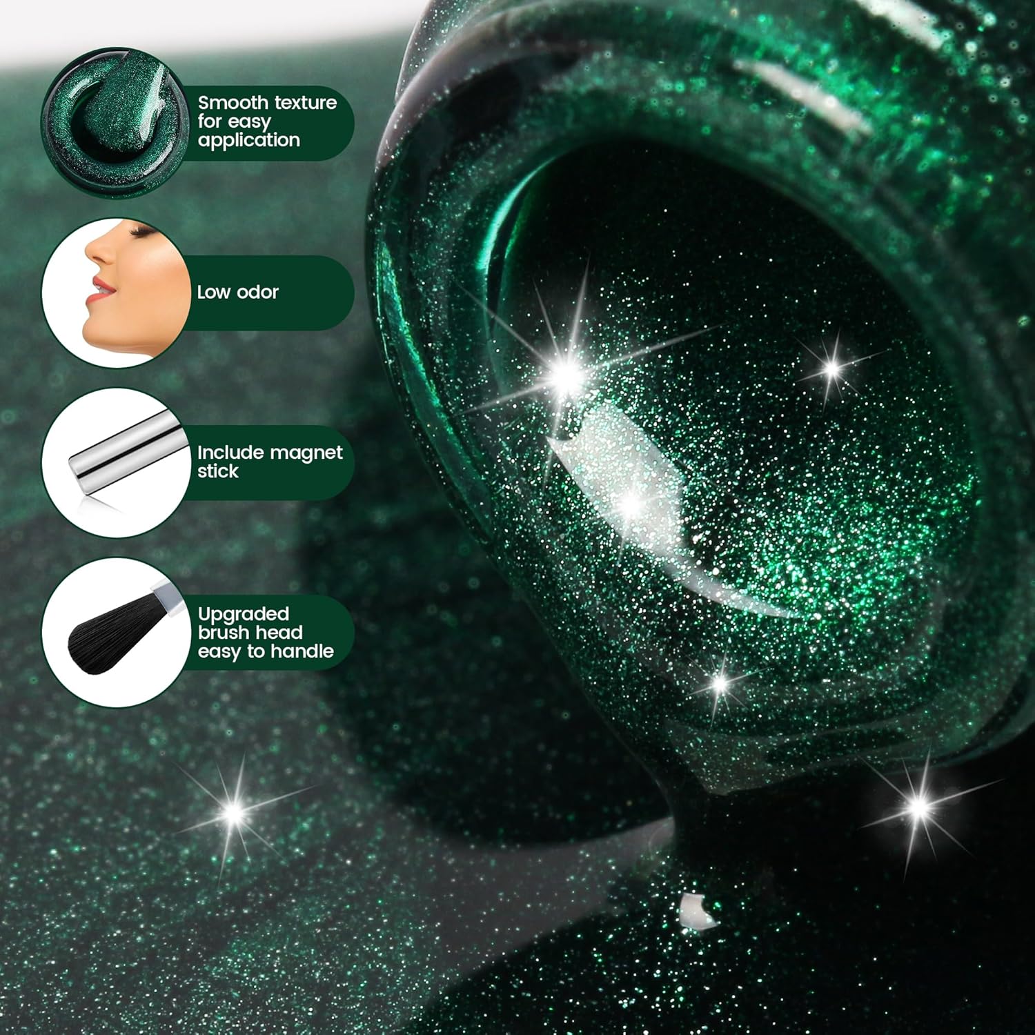 - Glitter Cat Eye Gel with Magnet Stick: The gel contains more upgraded high-gloss magnetic glitter for better shine and sparkle. With the magnet stick and refer to the tutorial for more practice, you can DIY a variety of cat eye patterns with lots of fun.