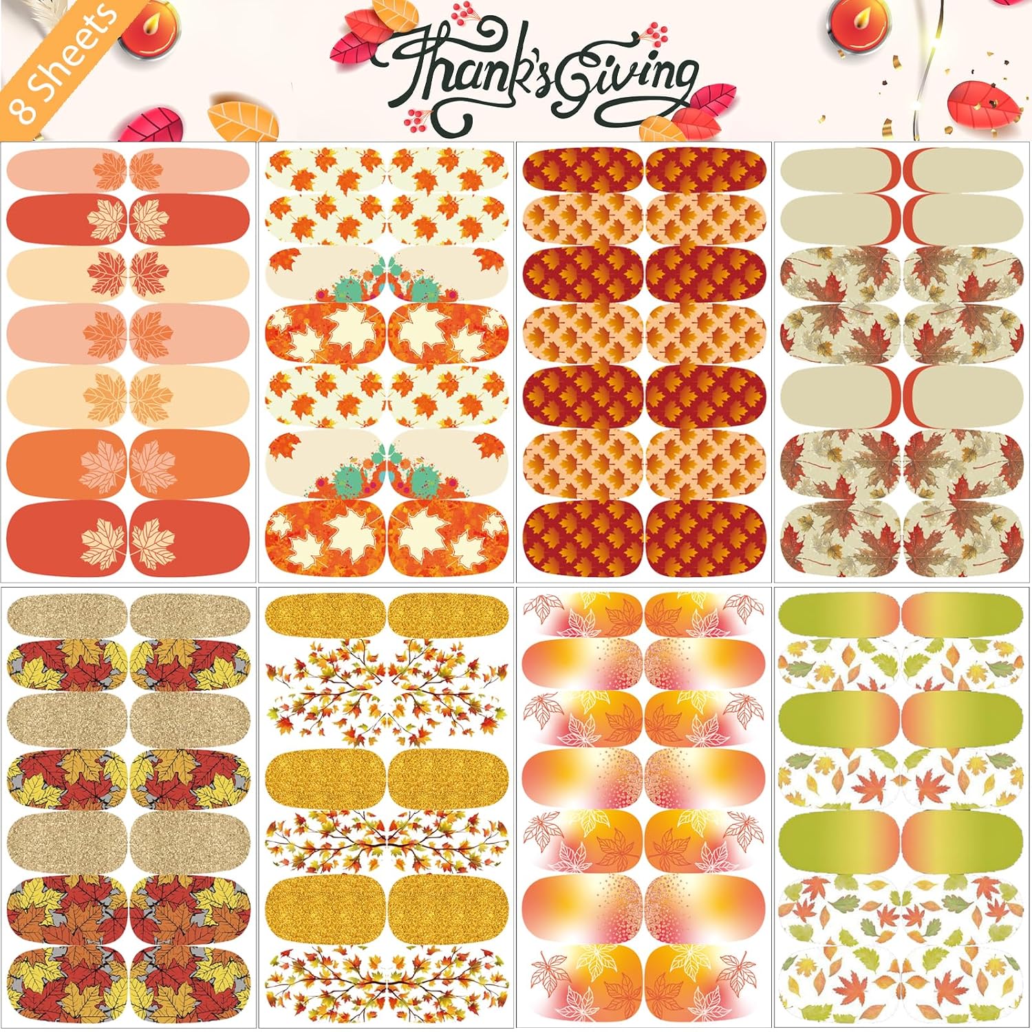 - Autumn Winter Holiday Value Package: You will receive 24 holiday nail art stickers and 2 nail files, with 8 each for Halloween, Thanksgiving, and Christmas. Rich colors and classic patterns, such as pumpkin, bat, Spider web, ghost, maple leaf, Santa Claus, Xmas tree, snowflake, snowman, reindeer, provide you with a variety of options to meet your rich imagination of nail DIY and create your own holiday.