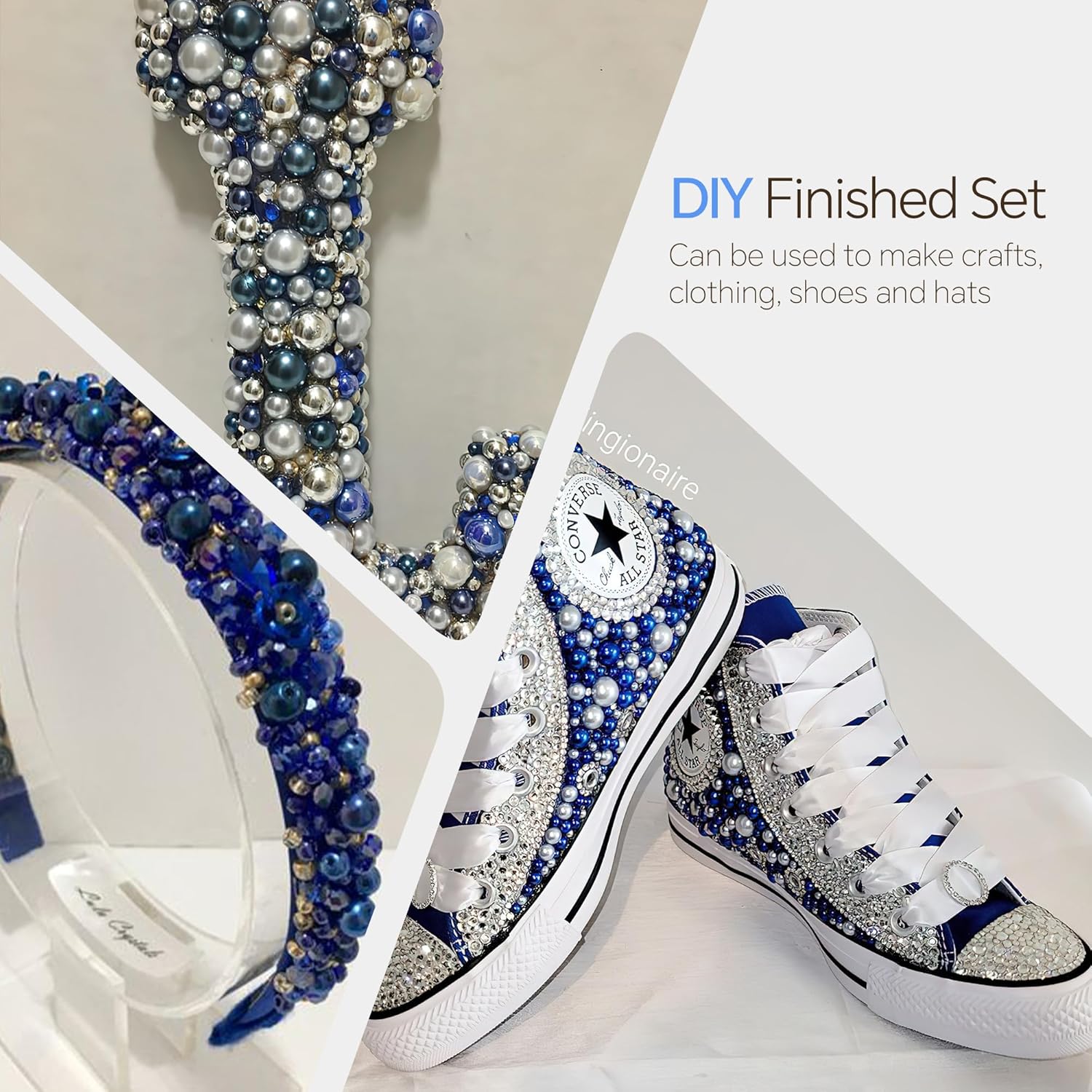 60g Blue White Pearls Rhinestones for Crafts Mixed Size 3mm-10mm AB Color Round Half Pearls Flatback Pearl Beads and Resin Rhinestones Set for Face Art with Gel