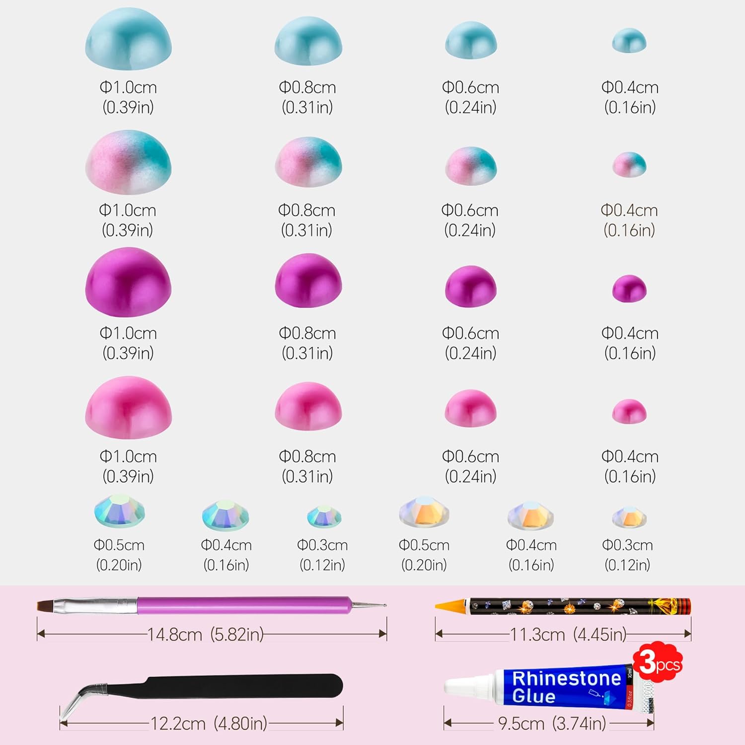 - What You Will Receive: 60g(30g*2)mixed size flat back pearls and rhinestones. 3*Rhinestone Glue. 1* wax pencil for rhinestones. 1*Pencil sharpener(color random). The mix half round pearls and rhinestones can make more beautiful handicrafts for your friends, parents, yourselfs on any festivals.If you need a mixed size pack of pearl rhinestones