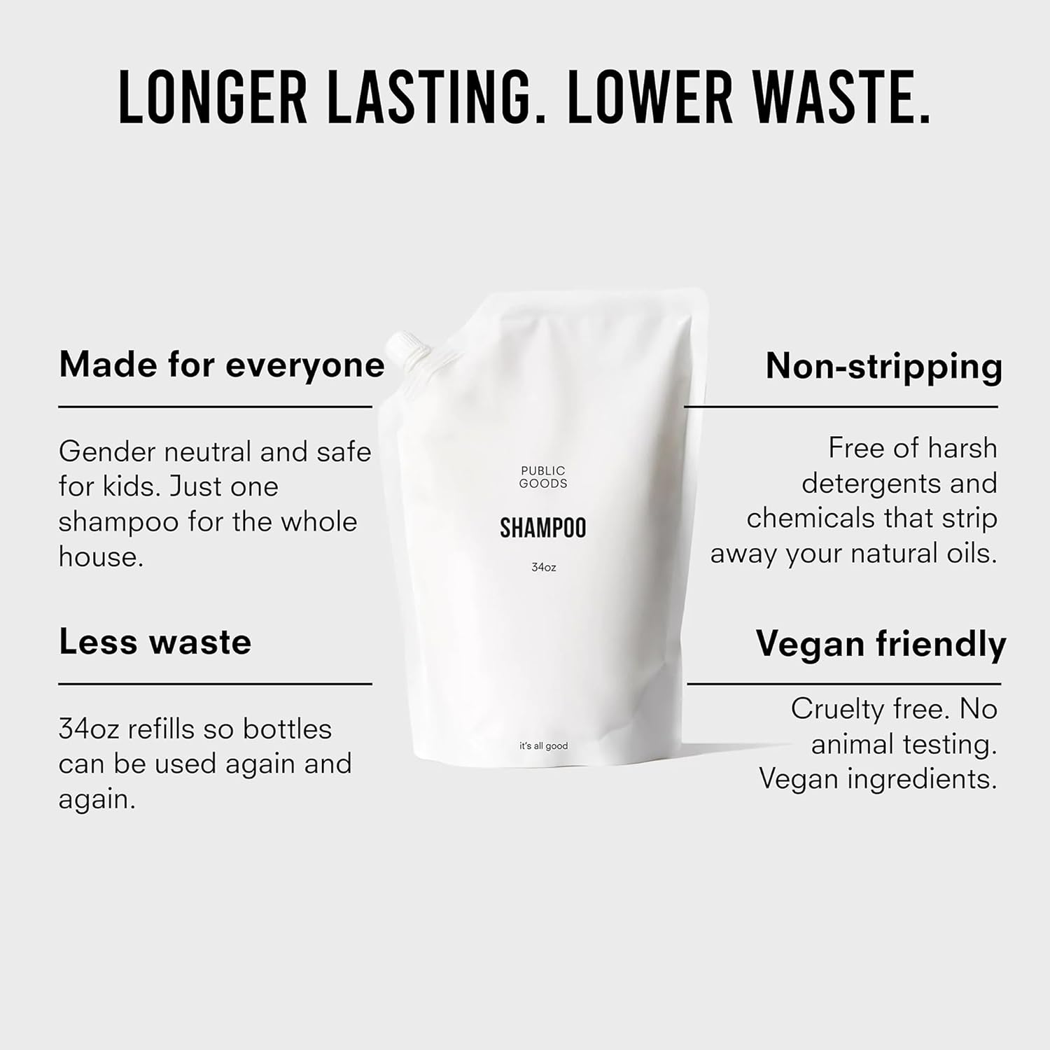 - Less Waste - Designed with sustainability in mind, our 34 ounce shampoo is ideal for refilling our 12 ounce bottle or one of your own.