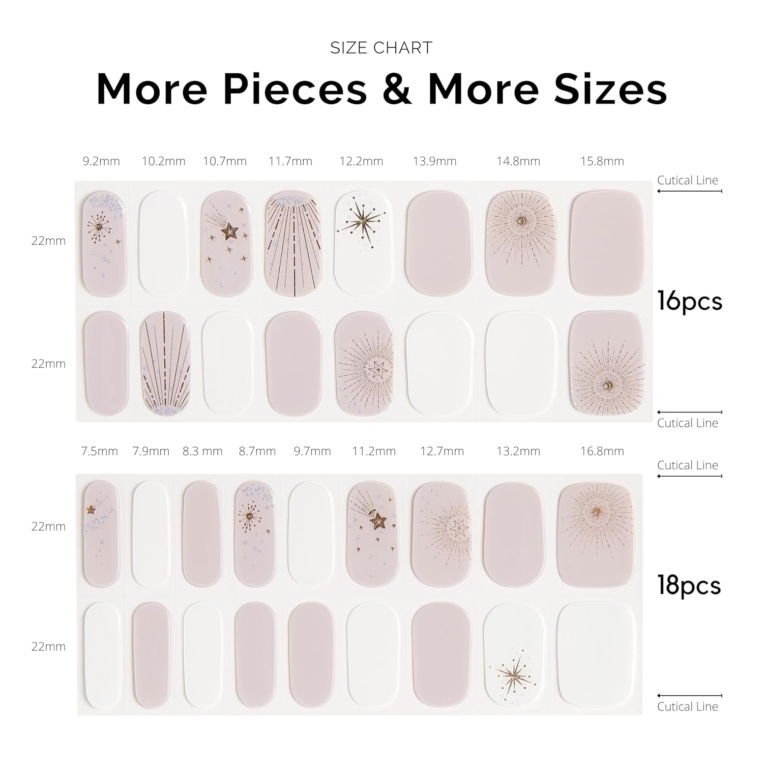 - ăWHAT YOU GETă34 Pieces gel polish strips in 17 sizes, 2 prep pads, 1 nail file, and 1 wooden stick. -Our semi cured nail strips are free from toxic, animal-derived, or harmful ingredients and are vegan, safe to use, and odorless. A perfect cost & time-saving DIY manicure kit.