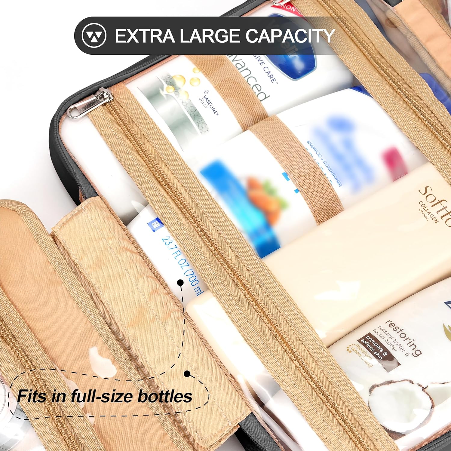 - PATENT PENDING GREAT ORGANIZER MASTER - This wash bag is designed with 4 toiletry storage compartments and a special jewelry compartment; you can easily put your wash products and jewelry separately to make your journey organized. The size of the fully-loaded state is 12.5''L x 10''H x 4.5''W, the 2 main compartments can hold up to 8 full-sized toiletries and cosmetics at the same time, no worries for long-distance travel.