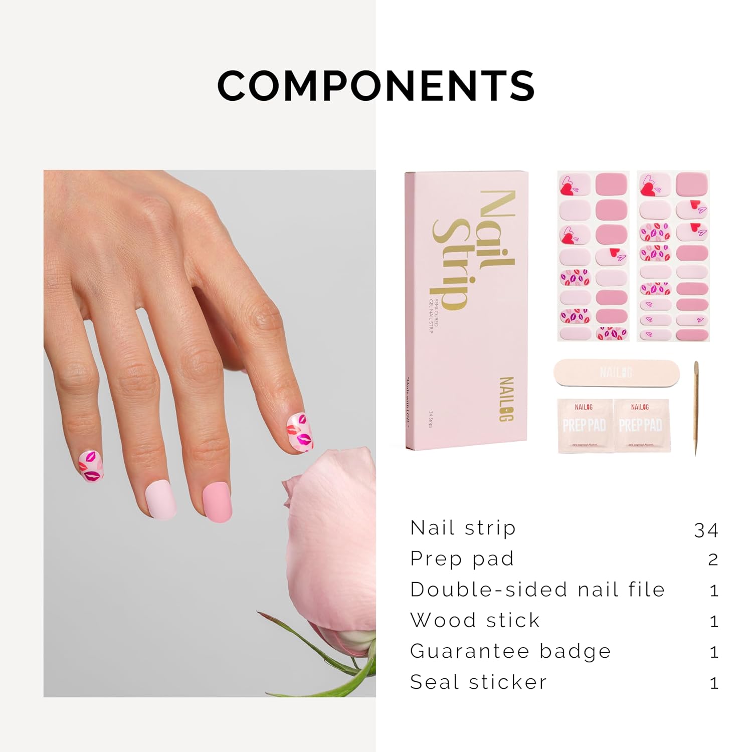 NAILOG Semi Cured Gel Nail Strips for Valentine's Day, 34 pcs Salon-Quality Gel Nail Stickers, Long Lasting Nail Wraps for Women with Soft Gel Finish Pink(Seal of Love)