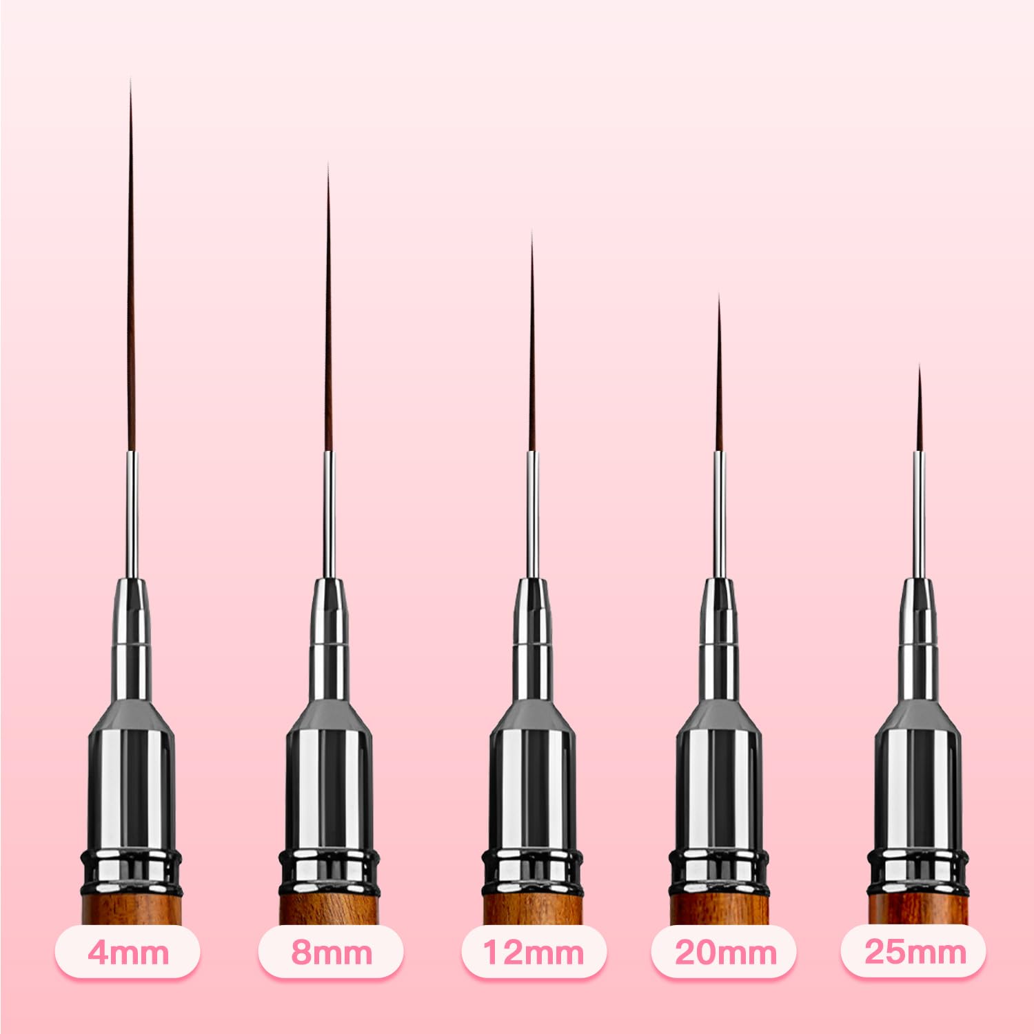 - Professional Nail Art Brushes: The thin nail art brush set contains 5 different size nail brushes 4mm, 8mm, 12mm, 20mm and 25mm. The total length of the pen: approx. 17.8 cm/ 7 inches.