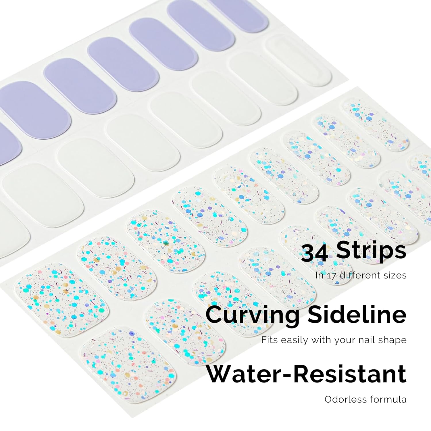 - ă34 PCS NAIL STRIPSăMore Quantity & Sizes than Ever! - With 17 different sizes of our nail art stickers, you can easily find the right size to match your nails. - New curved side line fits even better with your nail shape for seamless adhesion.