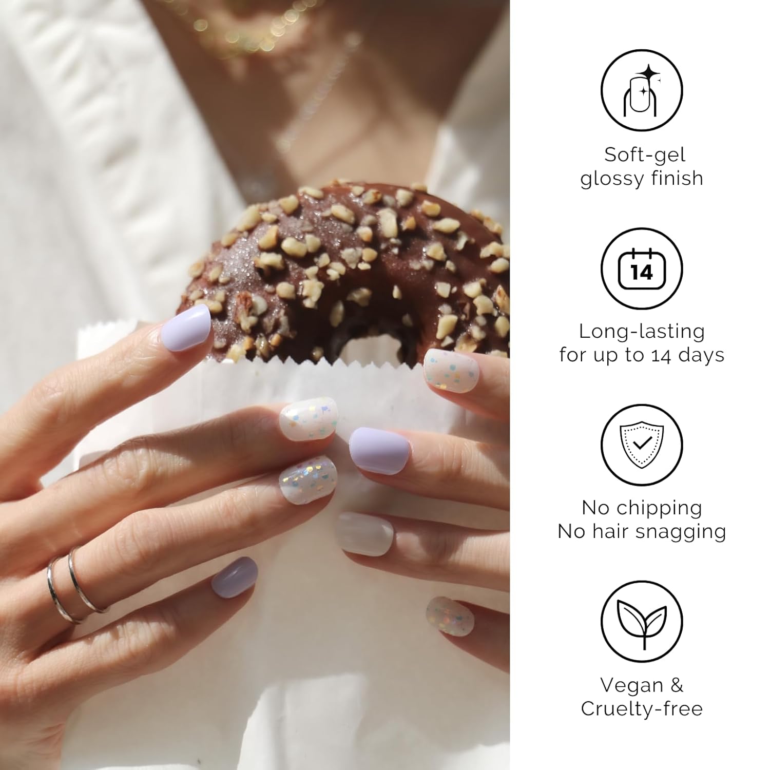 - ăSALON QULITYă Made of real nail polish 60% precured, soft to fit all nail shapes - Nailog semi-cured strips with waterproof top gel last up to 2 weeks once cured with a UV lamp. - Our gel nails are also extremely lightweight so they do feel like your own nails!