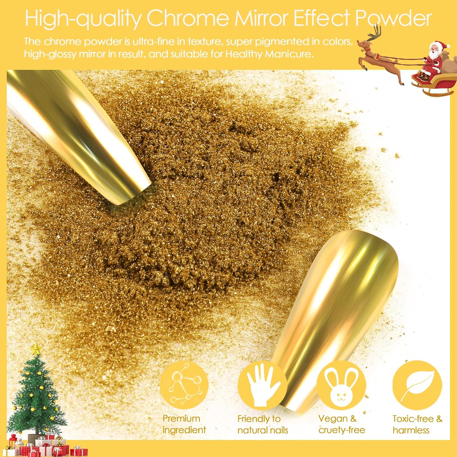 - Ultra Excellent Texture: Allstarry chrome nail powder gold is fine and smooth without particles feeling, so you can make your nails exquisite with an amazing mirror effect. Gold powder for nails is non-toxic, more durable, and environmentally friendly, which does not harm your nails and skin, using it more at ease. Chrome powder for gel nails is highly pigmented and provides an excellent metallic mirror effect that can last for several weeks if used correctly.