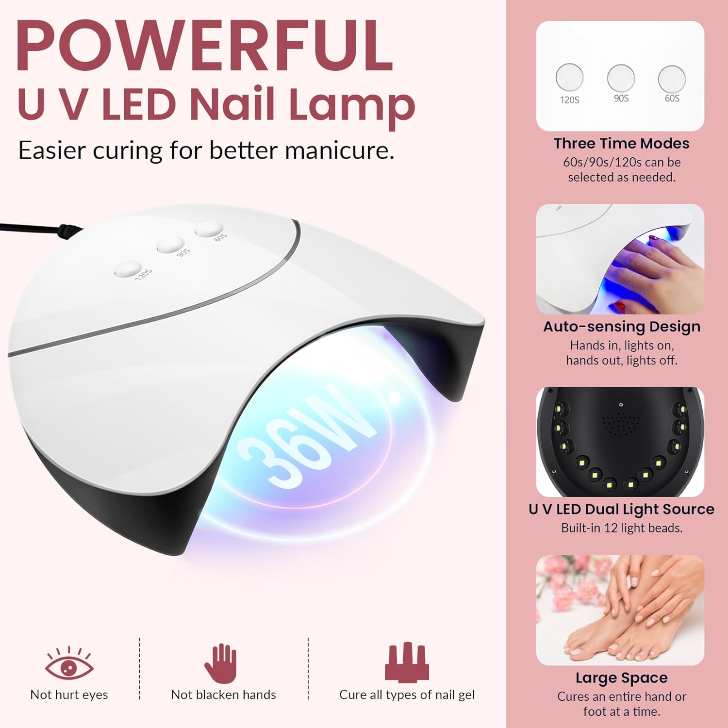 - ăAuto Sensor U V/LED Nail Lampă Professional nail light in this gel nail polish kit has three time options: 60s/90s/120s, and automatic sensor design, allowing you to easily control the curing of gel nail polish. U V/LED dual light source design, with 12 lamp beads, can efficiently cure almost all kinds of nail gel, not hurt your eyes, not black hands. Enough space to cure a whole hand or foot, bring you high quality nail art curing experience.