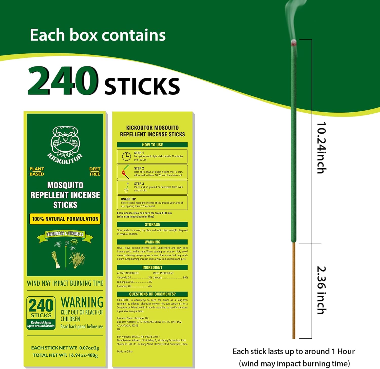 KICKOUTOR® Mosquito Repellent Outdoor Patio 240 PCS Natural Citronella Incense Sticks DEET Free Lemongrass Oil Gnat Mosquito Control for Indoor Backyard Travel Camping