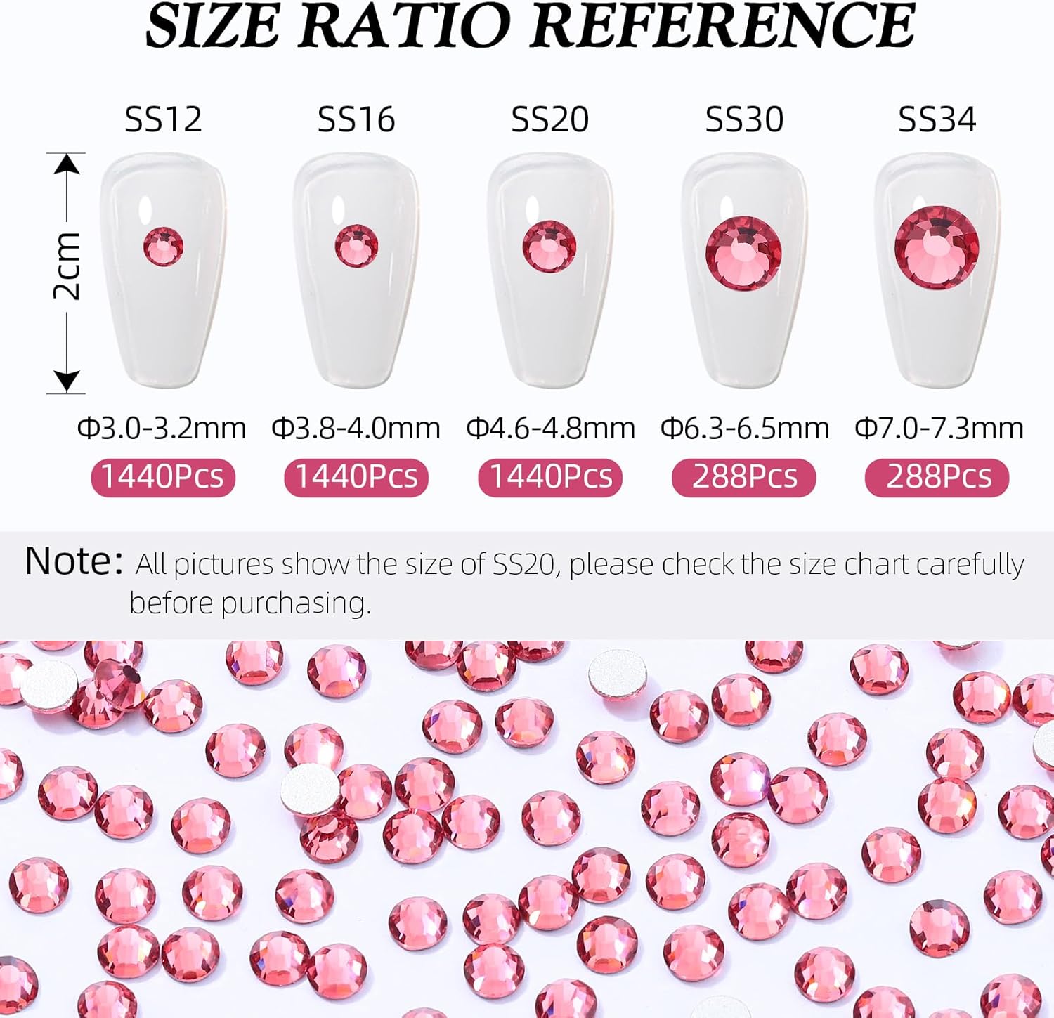 Rose Flatback Rhinestones, Glass Rhinestones for Nail Art and Craft, Glue Fix, Loose Crystal Gemstones(Rose, SS34, 288pcs, 7.1-7.3mm)