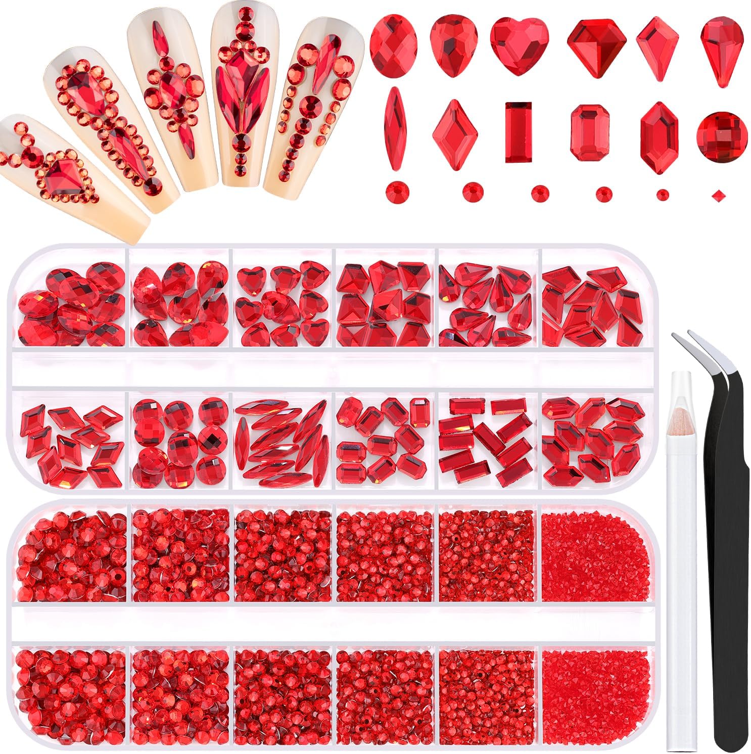 • 💎PACKAGE CONTENT -- The package contains 120Pcs multi shapes flatback gems crystal and 2510Pcs 1.5-4mm round beads, totally 2630Pcs Red rhinestones. Additionally, 1 tweezers for large size gems and 1 pickup pen for small size gems. This rhinestones kit makes it easy for you to make any nail art you like, and will bedazzle your acrylic nails!